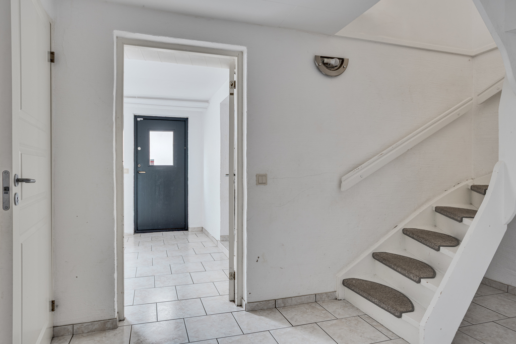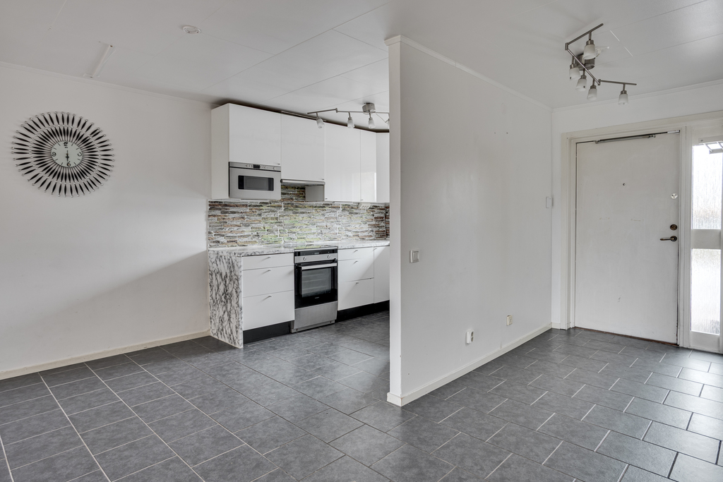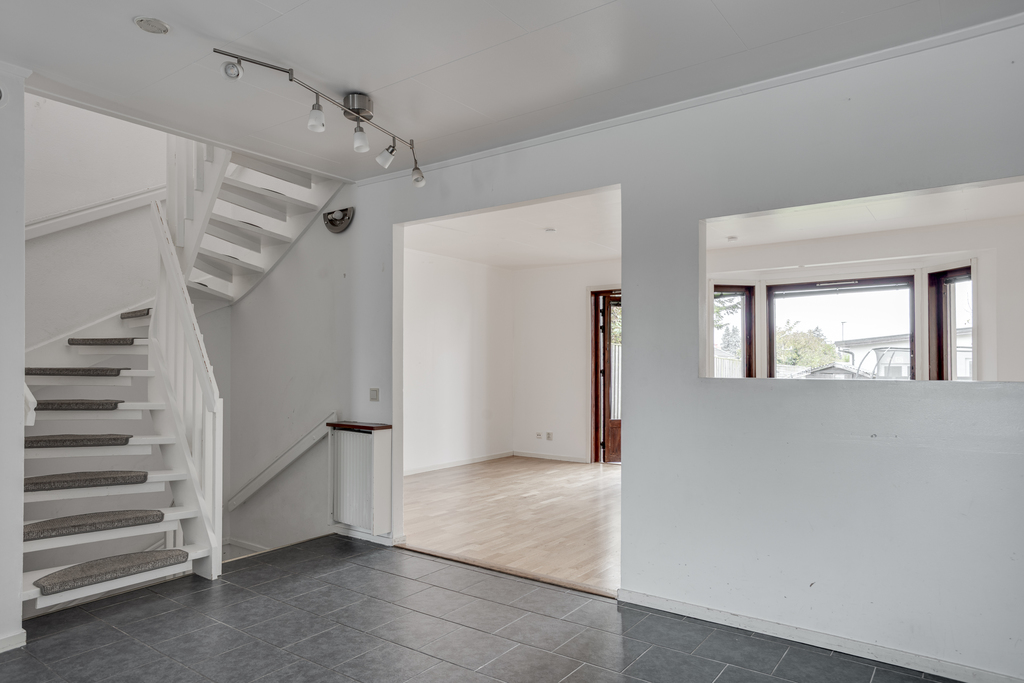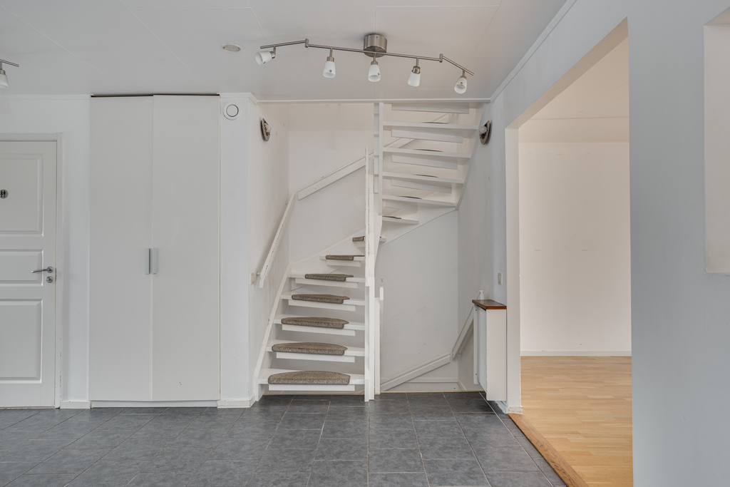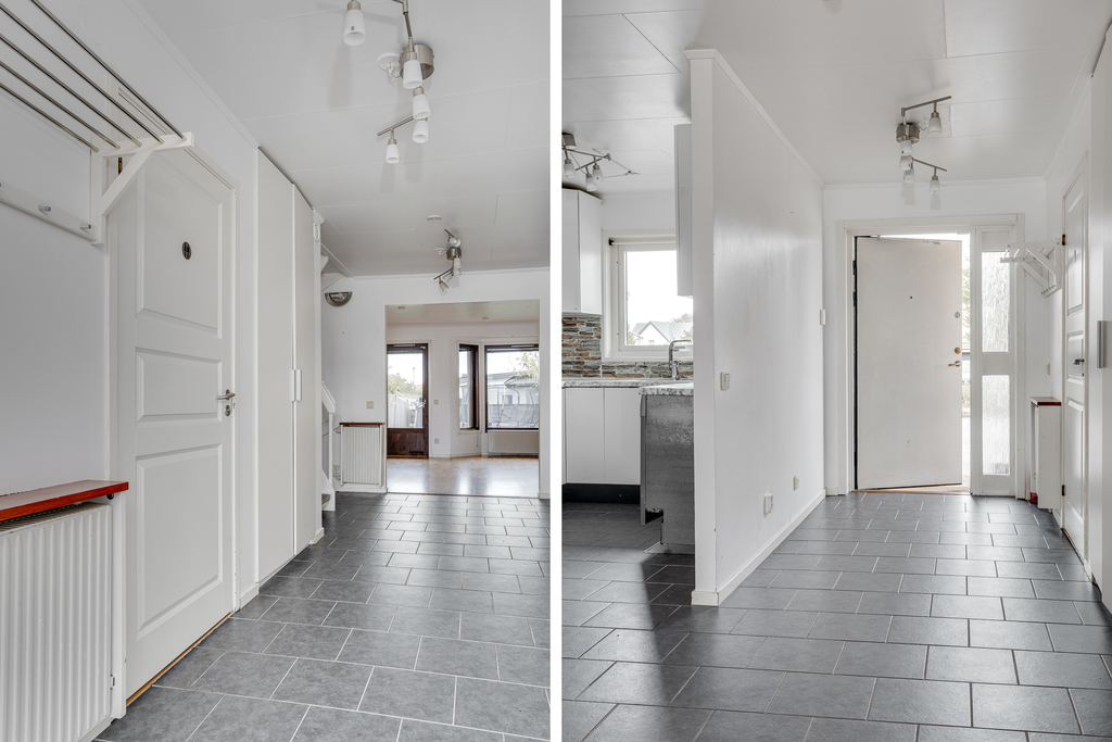 Luftig entréhall välkomnar in med blick rakt fram mot vardagsrummet och trädgården där utanför. Praktiskt och tåligt klinkergolv, vita väggar och gott om plats för ytterkläderna samt en inbyggd garderob ger extra förvaringsutrymme. Hallen mynnar ut i matrummet och härifrån leder även trappan vidare upp till ovanvåningen samt ner till källarplanet.