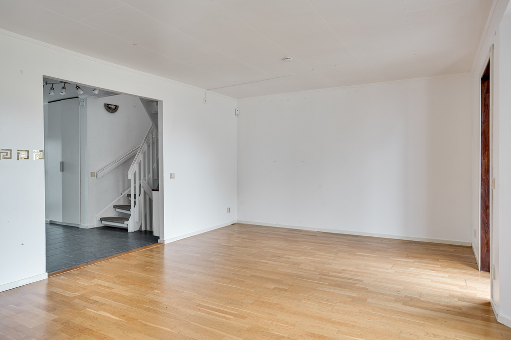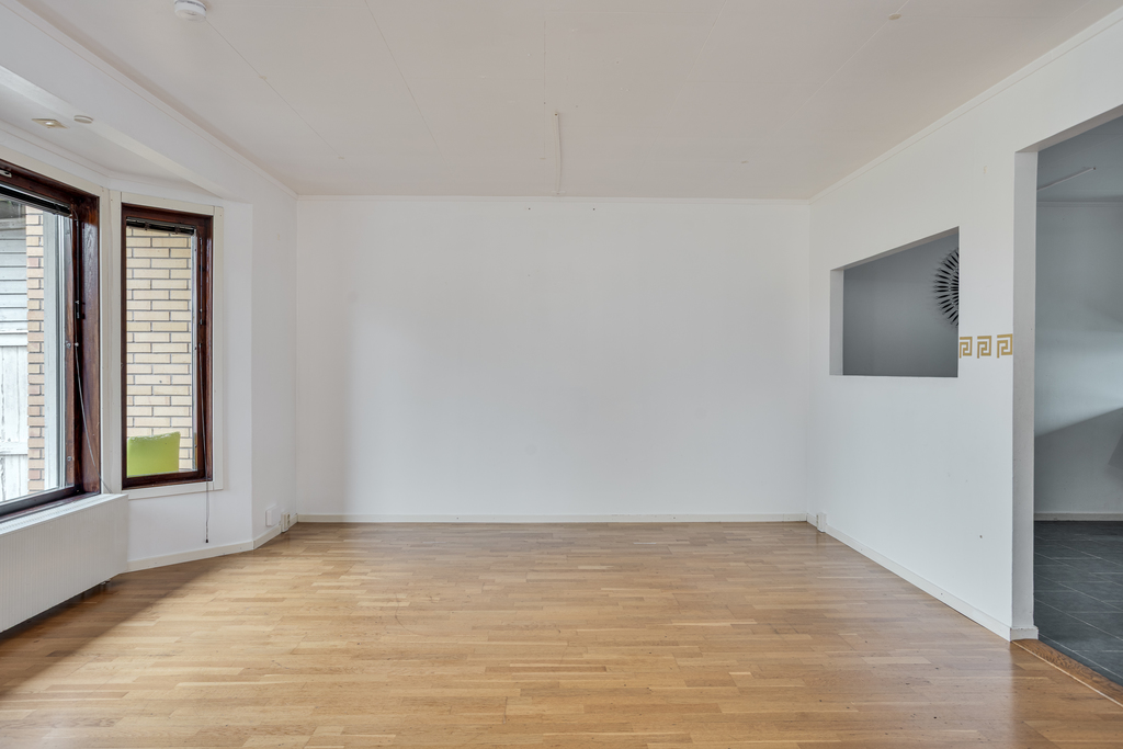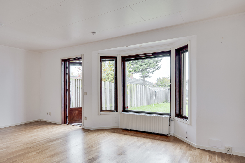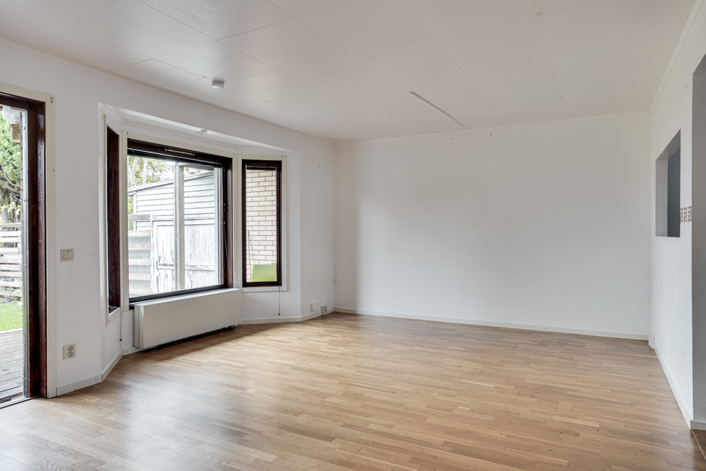 Vardagsrummet är ljust och luftigt med utgång till trädgård och uteplats. För den som uppskattar rymd och flöde kan möjlighet finnas att bygga om och öppna upp ytterligare mot matrummet – en förändring som skulle skapa fina och öppna sällskapsytor i husets hjärta. Ljusa väggar, parkettgolv och fina fönsterpartier i burspråk som släpper in dagsljuset.