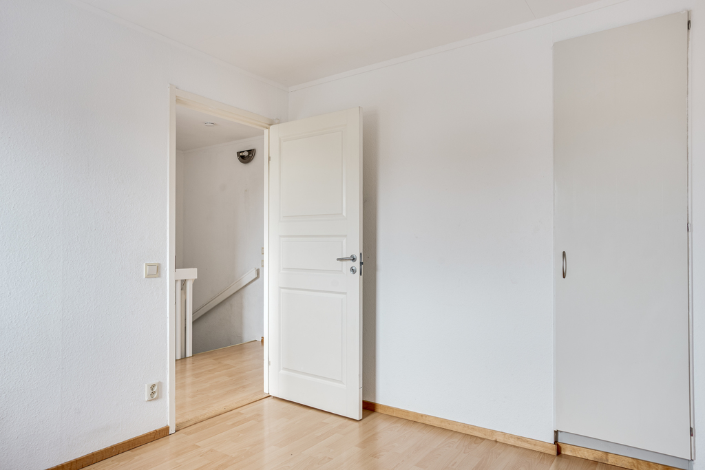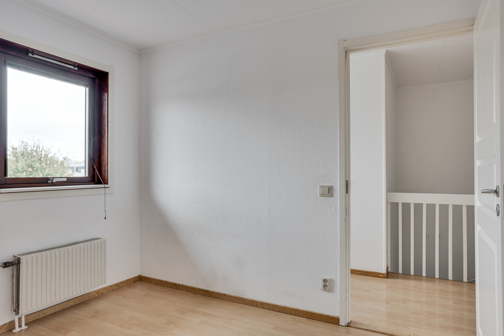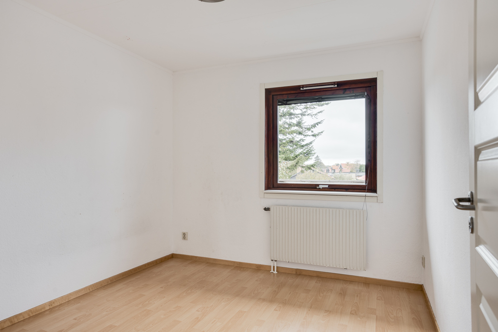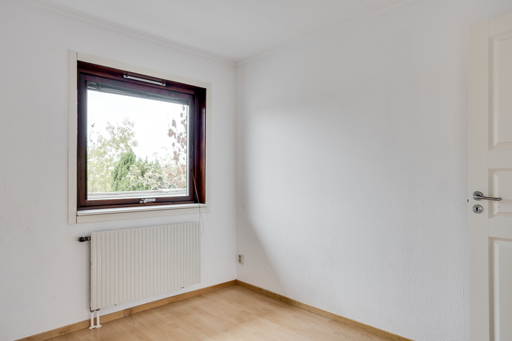 Det sista sovrummet är ett trevligt rum i nätt storlek med ljusa väggar, laminatgolv och fönster i öster mot husets framsida. Här finns också en inbyggd garderob.
