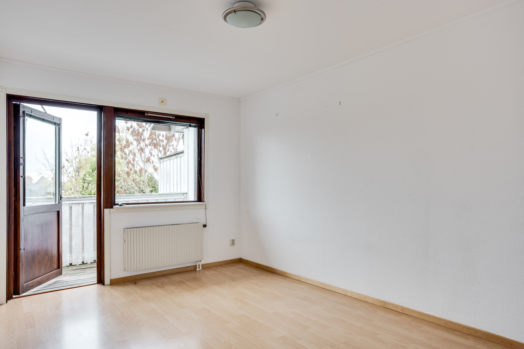 Husets största sovrum - ett master bedroom med egen utgång till balkongen och utsikt över trädgården nedanför. Här ryms enkelt dubbelsängen och plats finns över för ytterligare möblemang som skrivbord för hemarbetsplatsen eller varför inte favoritfåtöljen - trivsamt placerad vid fönstret där man kan krypa upp med en bok. Balkongen utgör en förlängning av rummet under den varmare årstiderna - här sitter man gärna och låter dörren stå öppen för att släppa in sommarvindarna. Samma ljusa laminatgolv som i rummet bredvid, vita väggar och inbyggda garderober.