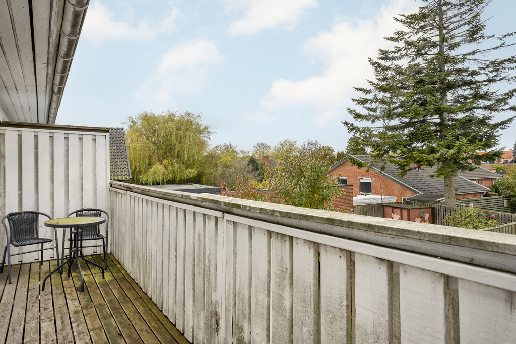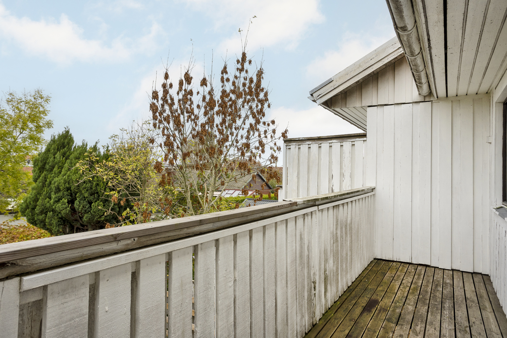 Från det andra sovrummet nås balkongen som är stor och täcker hela husets långsida samt ligger i västerläge där eftermiddags- och kvällssolen skiner. Här sitter du i ett fritt och öppet läge med utsikt över trädgården - perfekt för en lugn stund i solen.