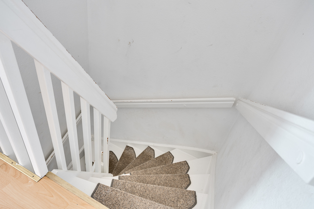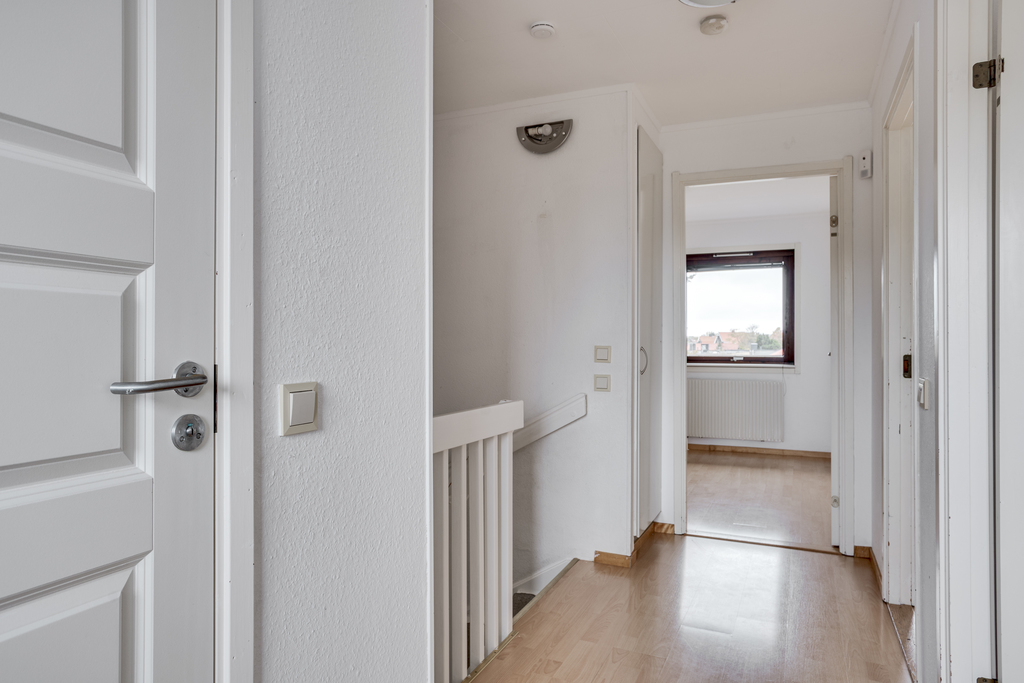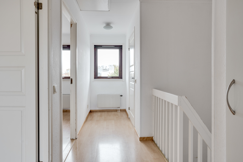 Hallen på ovanvåningen har dörrar in till samtliga sovrum, badrummet och en inbyggd garderob för extra förvaring. Ett fönster i slutet av gången släpper in ljus och skapar en trivsam känsla och en lucka i taket leder upp till vinden. Ljust laminatgolv och vita väggar.