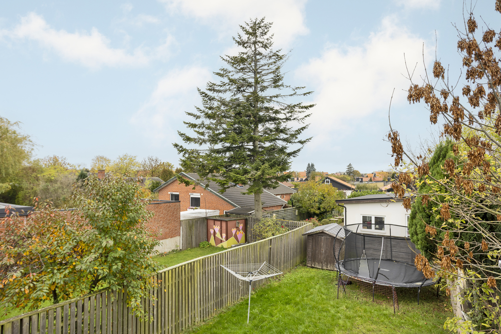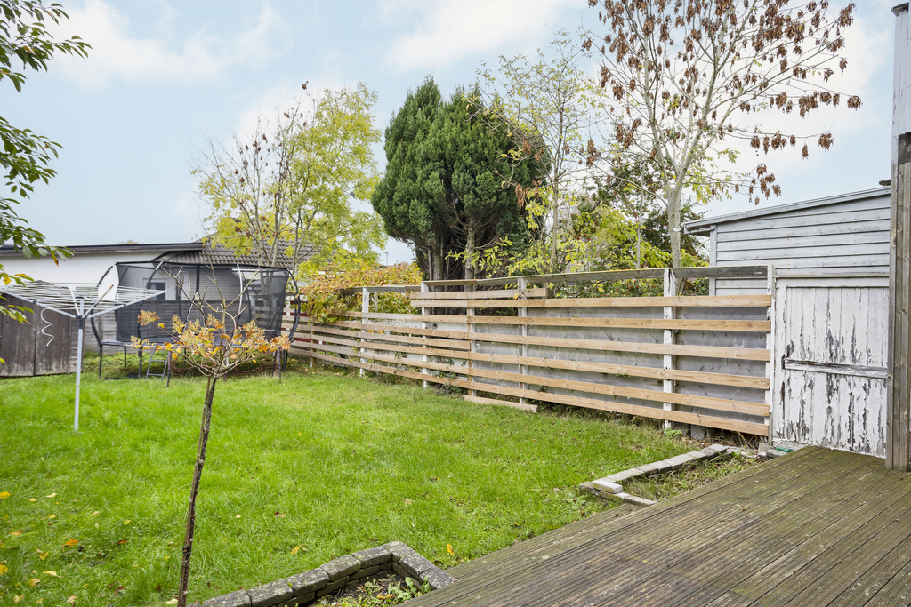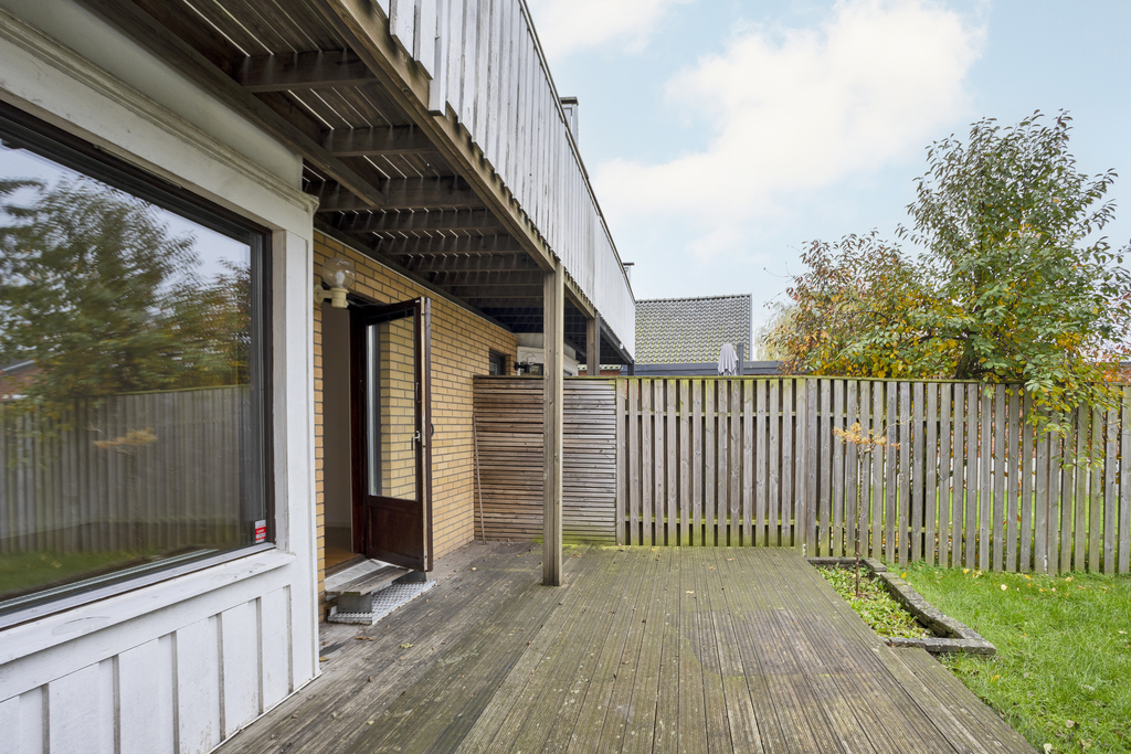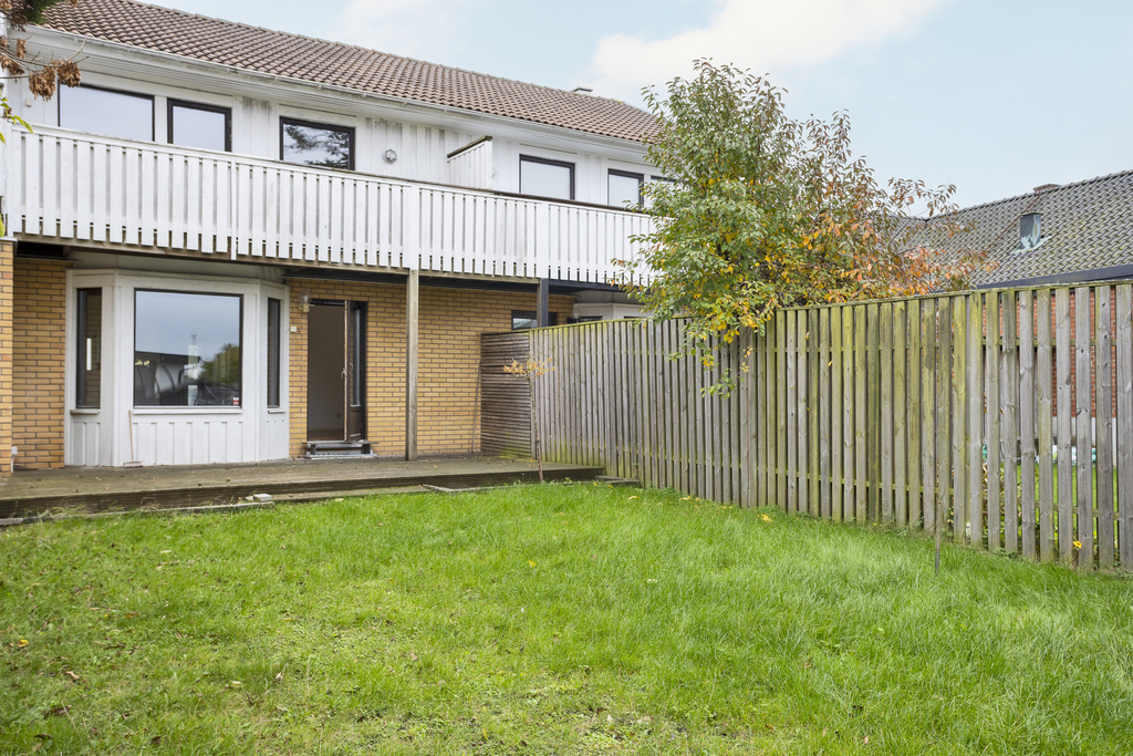 Inbjudande och lättskött trädgård i västerläge där kvällssolen skiner. En stor terrass skyddas delvis av balkongen ovanför och har direktaccess till vardagsrummet - perfekt för sommarens alla grillkvällar! Grön gräsmatta som är precis lagom stor för barnlek och spring men ändå har plats över för odlingslådor och fina planteringar där den med gröna fingrar trivs bäst. Trädgården är omgiven av staket som blir en trevlig inramning.