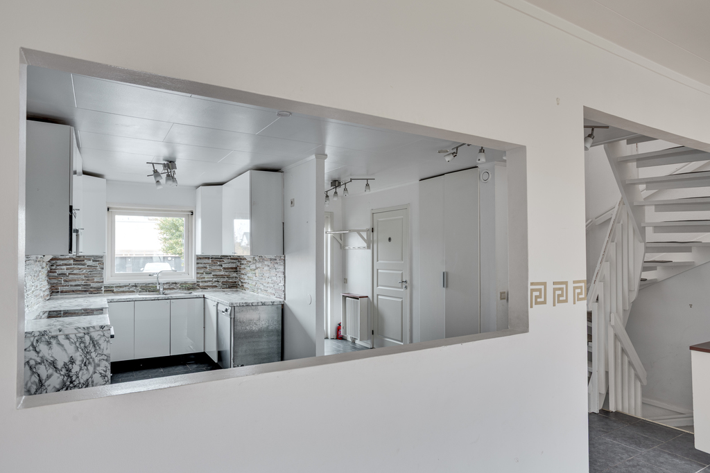 Praktiskt arbetskök som ligger öppet mot matrummet och har inredning planerad i u-form, vilket ger gott om både skåpsutrymme samt fina arbets/avställningsytor. Vita skåpsluckor, bänkskiva i ek klädd i marmormönstrad dekorplast och vitt kakel med kakeldekor i stendesign ovanför som stänkskydd. Spis med häll och ugn, spisfläkt, diskmaskin och inbyggd microvågsugn. Rostfri vask med vidhängande avställningsuta är placerad nedanför köksfönstret med utsikt mot husets framsida. Klinkergolv och vita väggar som följer oss vidare ut i ett luftigt matrum där ett matbord för hela familjen ryms enkelt. Kontakt med vardagsrummet både via ett brett valv och en öppning i väggen som bidrar med en luftig känsla.