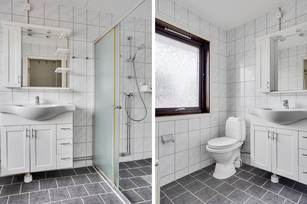 Badrummet på entréplan är helkaklat i marmorerat ljusgrått med klinkergolv i sobert mörkgrått. Duschplatsen avskärmas av transparent duschvägg och här finns wc, handfat, badrumsskåp och spegel. Ett fönster med frostad ruta släpper in dagsljuset utan att tillåta insyn.