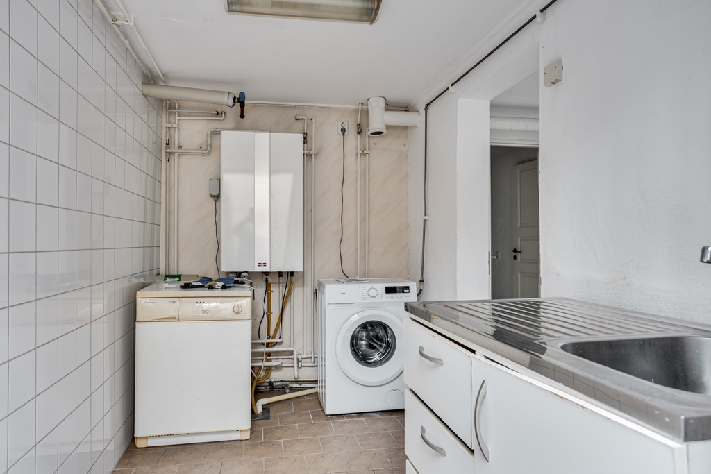 Tvättstugan är placerad i källaren med smidig direktaccess inifrån huset men även med en egen utgång. Här finns tvättmaskin och torktumlare samt rostfri vask med underskåp och lådor för förvaring. Här huserar även husets fjärrvärmeväxlare. Klinkergolv och väggar som är delvis målade, kaklade samt har ett parti med våtrumstapet.