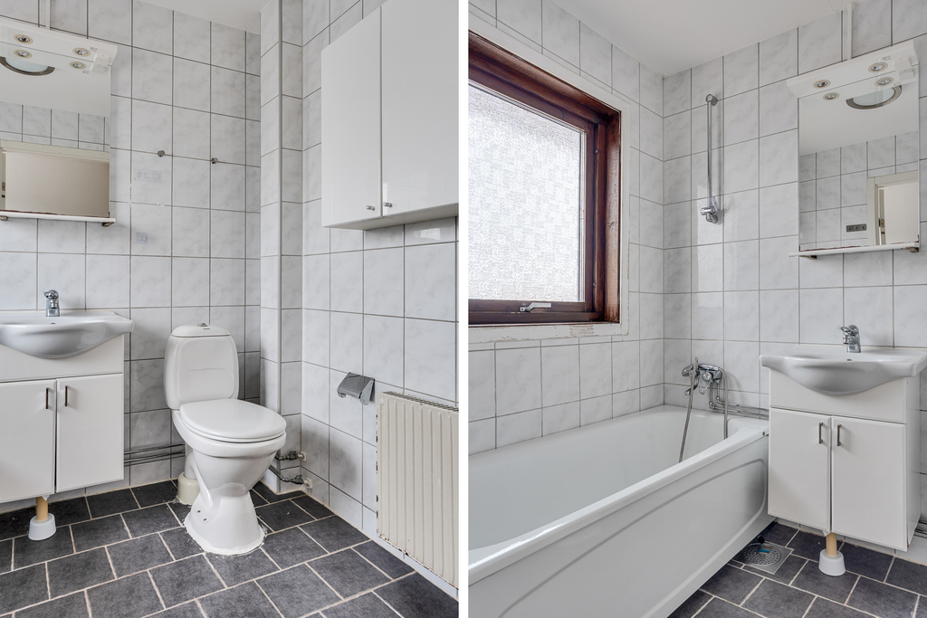 Badrummet på övre plan är även det helkaklat i samma stil som bottenvåningen med ljusa, marmorerade väggar och grått klinkergolv. Ett fristående badkar passar lika bra för en snabb dusch innan jobbet som för ett ångande skumbad när vintervindarna viner utanför. Även populärt med badmöjligheter för familjens yngre medlemmar! Wc, handfat med kommod, badrumsspegel och ett fönster med frostad ruta som dagsljusinsläpp.