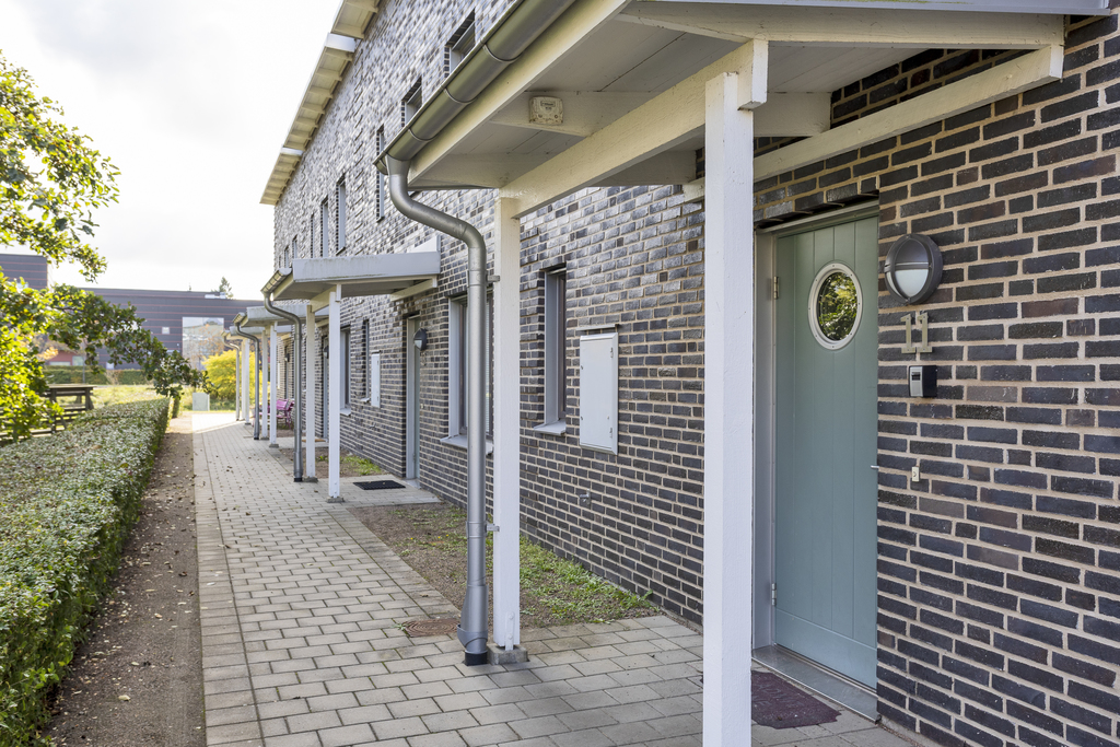 En stensatt gång löper längs husens framsida där den som önskar kan ha plats för ett nätt cafémöblemang vid ytterdörren. Här skiner förmiddagssolen och morgonkaffet passar perfekt.