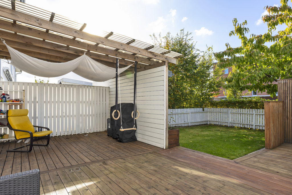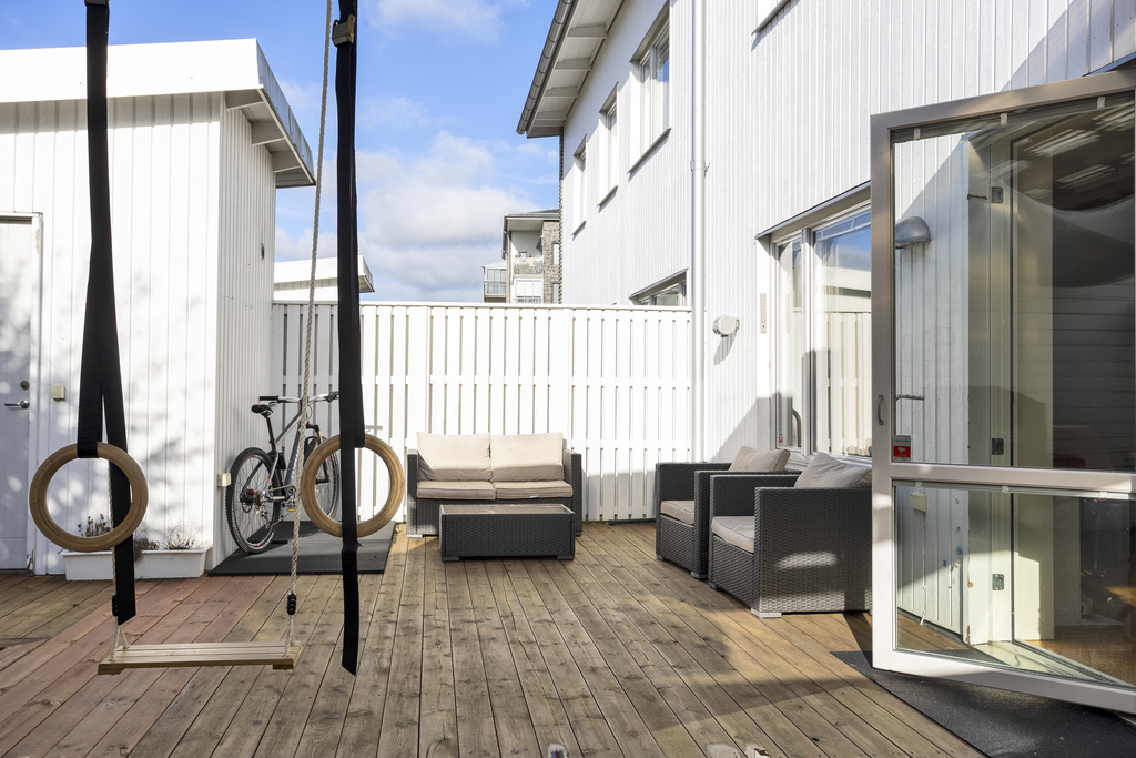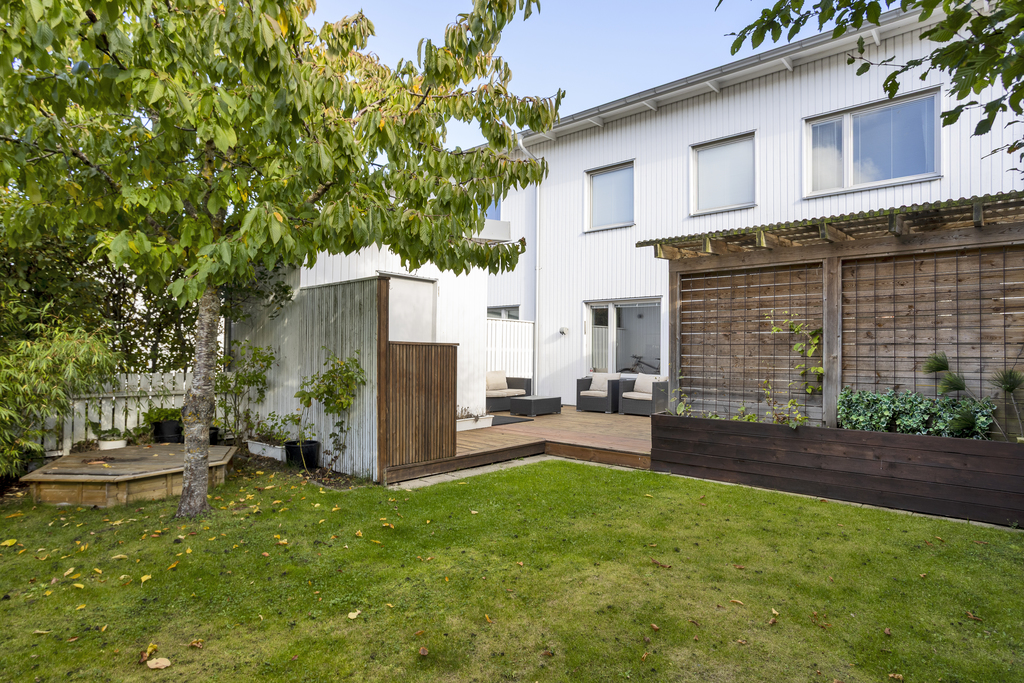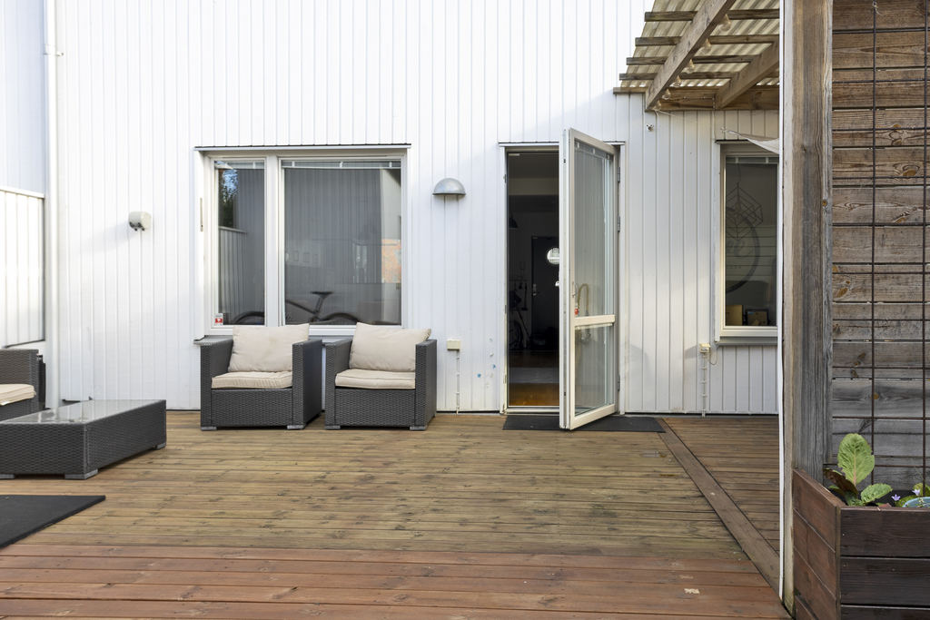 Stor och insynsskyddad uteplats som vetter mot den egna trädgården på husets baksida. Trädäck är skönt för bara sommarfötter och här finns både en öppen och en överbyggd del - där man gärna sitter när kvällarna börjar bli kyliga eller vädret bjuder på en regnskur. Gott om plats för både utemöblemanget och grillen, det givna stället att spendera lediga dagar tillsammans med familjen! Ett rymligt förråd med plats för allt som behövs för ett bekvämt radhusliv nås från terrassen och staket på båda sidor skyddar uteplatsen mot insyn. Längs gräsmattan finns en fin liten häck som delar av trädgården från området bakom.