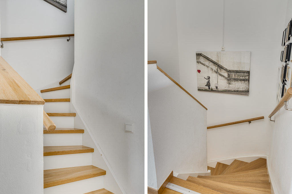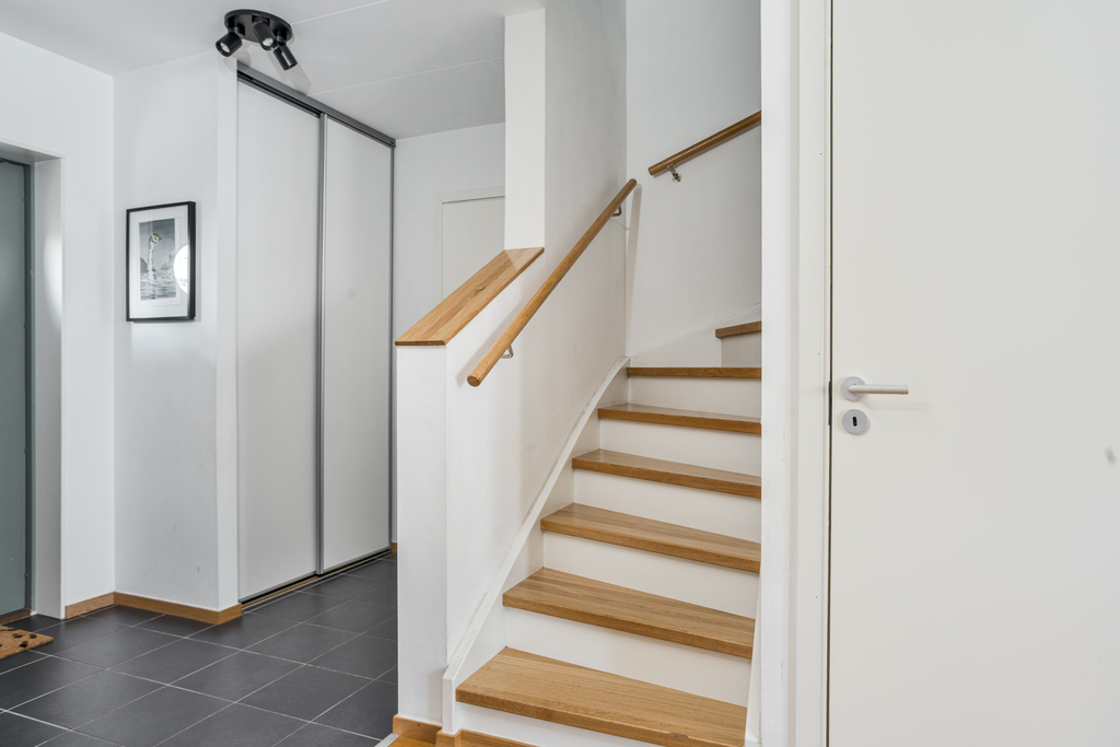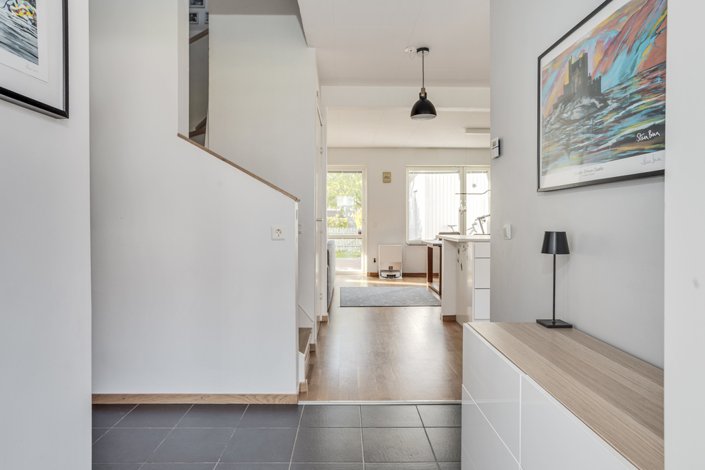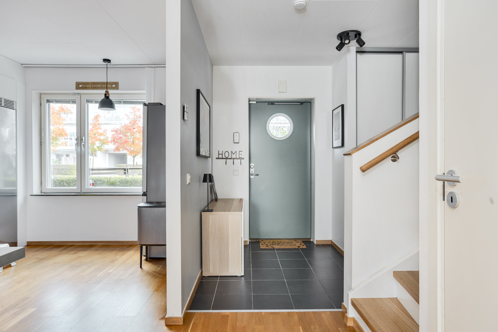 Entréhall välkomnar in genom dörr med fönster och praktiskt klinkergolv samt plats för avhängning av ytterkläderna i en dubbel inbyggd garderob med skjutdörrar. Hallen leder vidare in till öppen och ljus passage mellan vardagsrum och kök - härifrån går trappan upp till ovanvåningen och under denna finns ytterligare förvaringsyta i ett förråd som kan nyttjas till allt från skafferi till mysig koja för barnen.
