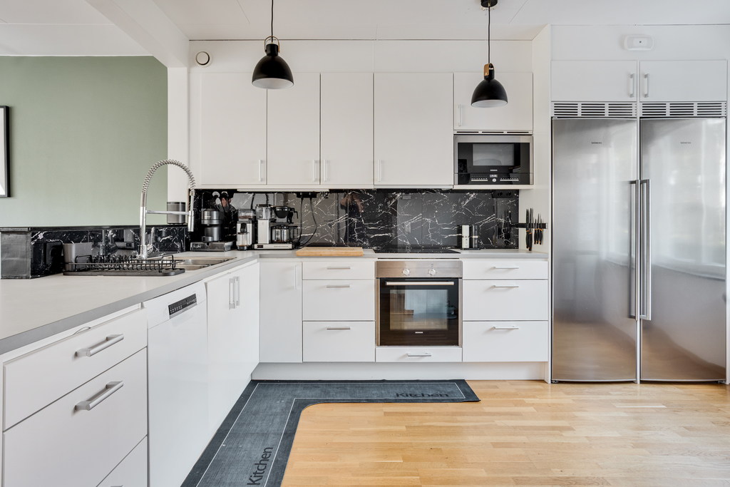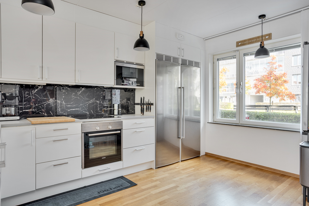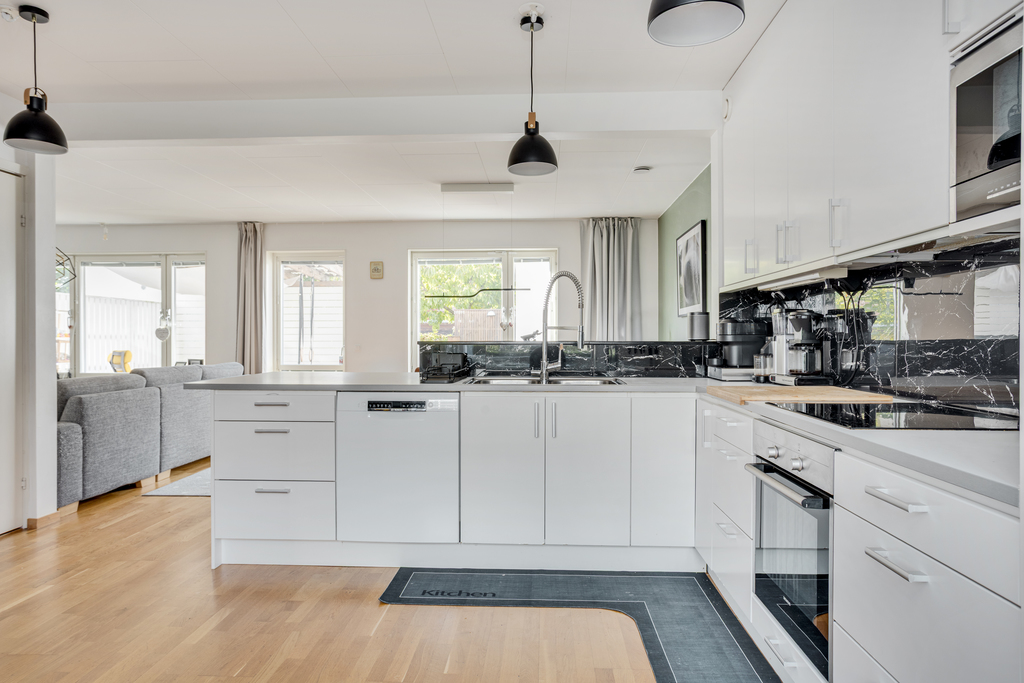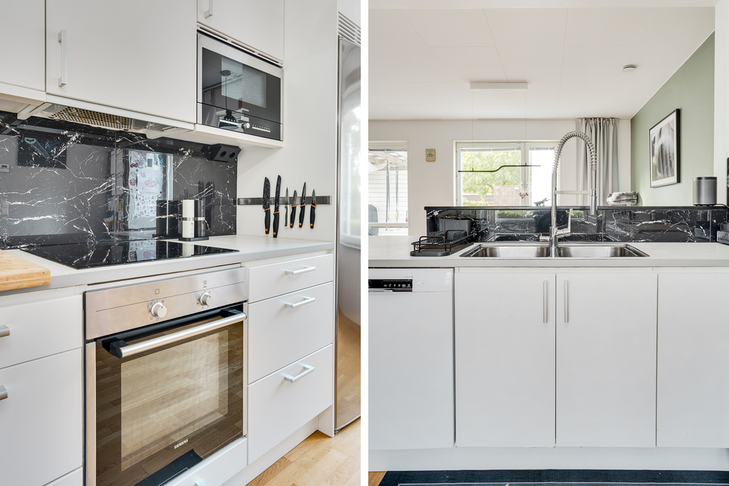Köket ligger delvis öppet mot vardagsrummet - vilket låter dagsljuset skina genom huset och ger en behagligt luftig känsla samtidigt som kastruller och middagsstök hålls diskret utom synhåll. Stilren inredning från Vedum i vitt planerad i vinkel ger både generösa arbetsytor samt gott om skåpsutrymme. Fullt utrustat med kyl och frys i fullstorlek och rostfritt utförande (Siemens), inbyggd ugn och mikrovågsugn (Siemens), diskmaskin (2025), induktionshäll (Samsung 2019) och tillhörande spisfläkt.