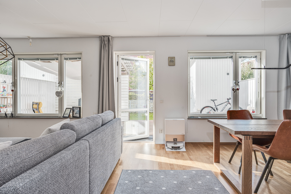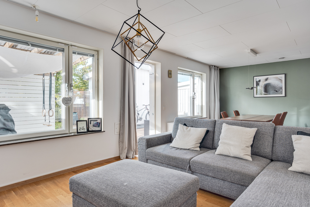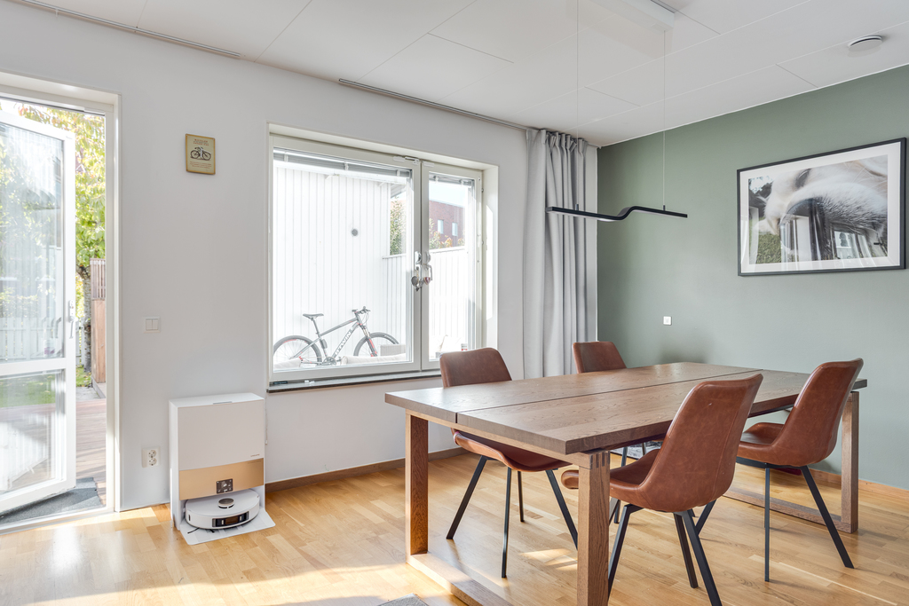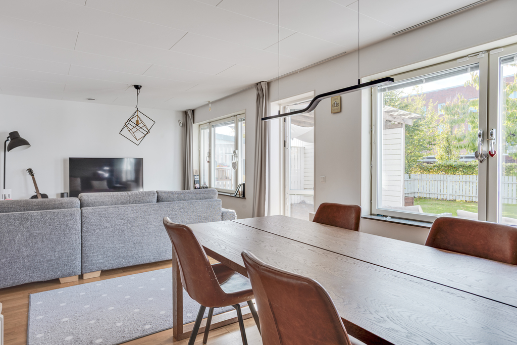 Ljust och inbjudande vardagsrum som sträcker sig över hela husets bredd och har luftigt öppen planlösning mot köket. Här finns stora fönsterpartier som släpper in dagsljuset samt glasdörr ut till uteplatsen på husets baksida där eftermiddagssolen skiner. Utformningen gör ytan lättplanerad - gott om plats för soffgruppen men även matsalsmöblemanget som båda har sin givna och perfekta plats. Ett rum med fina sociala ytor, som gjort för umgänge och middagar med vänner men även perfekt för lugna kvällar på tu man hand. Fint parkettgolv och vita väggar med en fondvägg i mjukt grönt.