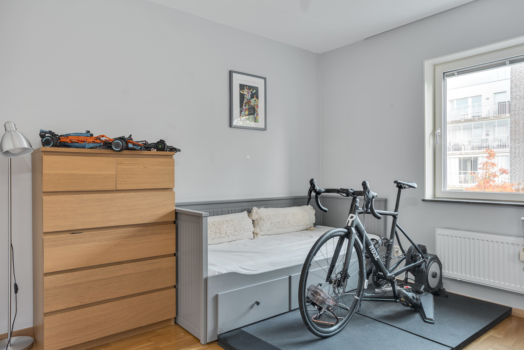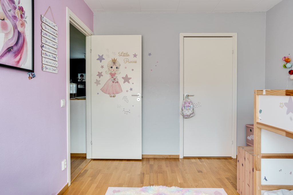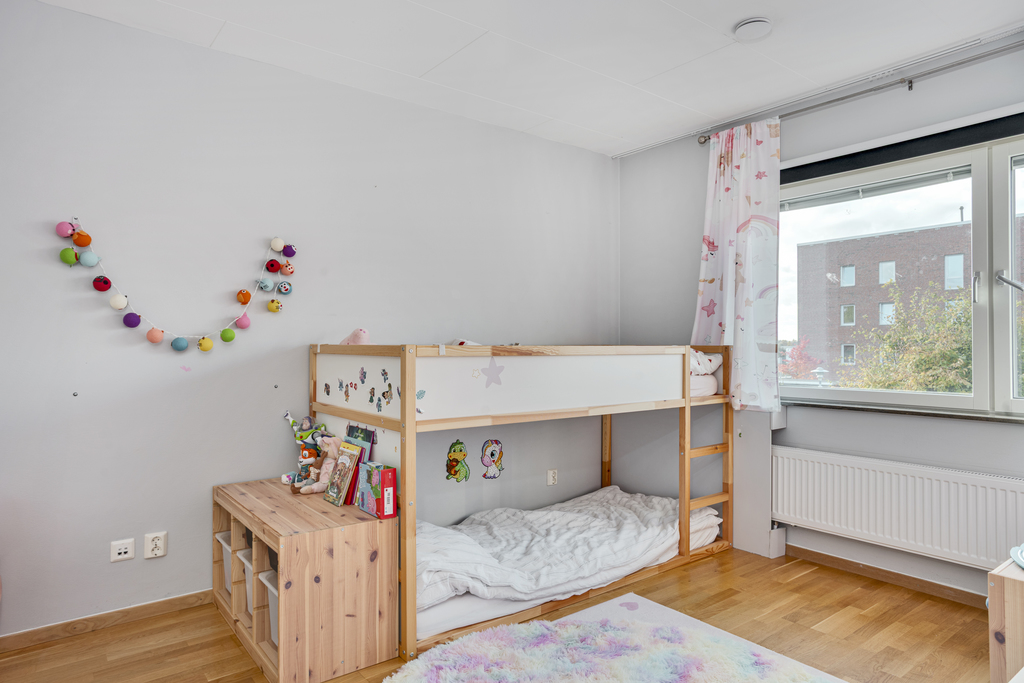 Bredvid finns ytterligare ett sovrum med samma parkettgolv som de andra sovrummen och väggar i ljust grått. Fönster mot husets framsida där morgonsolen tittar in och praktisk, inbyggd garderob för förvaring.