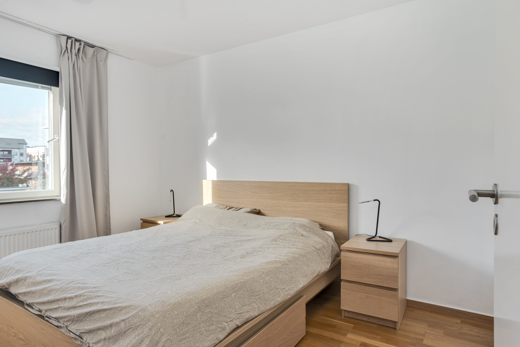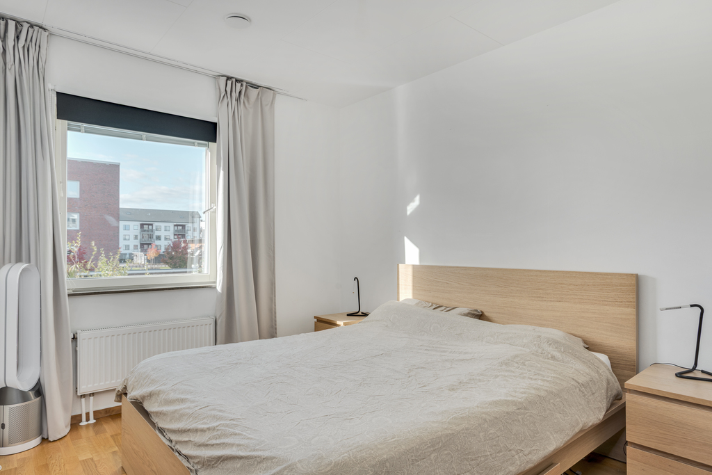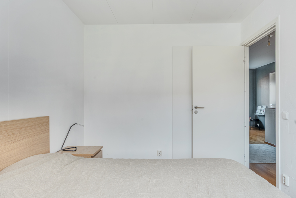 Ännu ett trivsamt sovrum som ligger vägg i vägg med sovrum nummer tre och har fönster i väster mot uteplatsen på husets baksida. Ljusa väggar, inbyggd garderob för förvaring och samma fina golv som i resten av huset, vilket skapar en behaglig och harmonisk känsla.