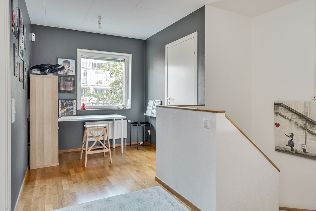 Ovanför trappan finns en ljus och luftig hall - idag möblerad som praktisk arbetshörna med skrivbord och bokhylla. Parkettgolv, väggar målade i mörkt grått och fönster mot husets framsida.