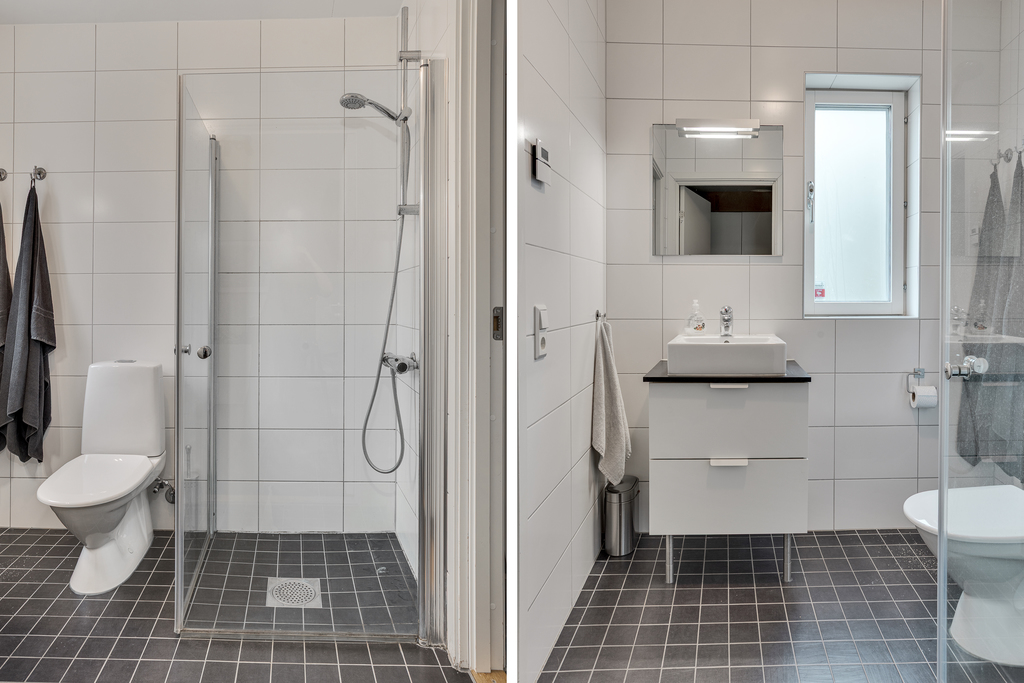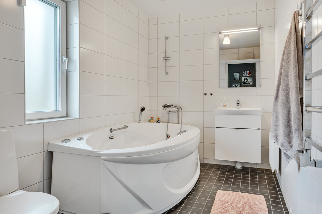 Ytterligare ett badrum i samma stil som bottenvåningens, men här med ett stort, lyxbetonat badkar med bubbelfunktion istället för dusch. Ett trevligt tillägg för både barnfamiljen och alla som uppskattar ångande varma skumbad medan höstvindarna viner utanför. Kinkergolv i grått och vita fräscha väggar med ett frostat fönster som ljusinsläpp. Wc, handfat med kommod, badrumsskåp med spegel och handdukstork.