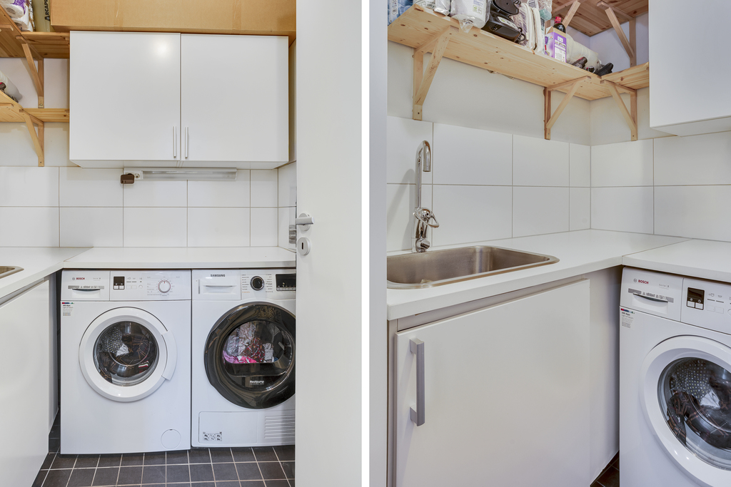 En separat tvättstuga ger ett bekvämt eget rum för tvätt utan att behöva dela utrymme med badrummet. Tvättmaskin -20 och torktumlare -23 under praktisk arbetsbänk, rostfri vask med tillhörande avställningsyta och överskåp för förvaring. Samma mörkgrå klinkergolv följer oss in hit från badrummet och ovanför arbetsbänken sitter vitt kakel som stänkskydd.