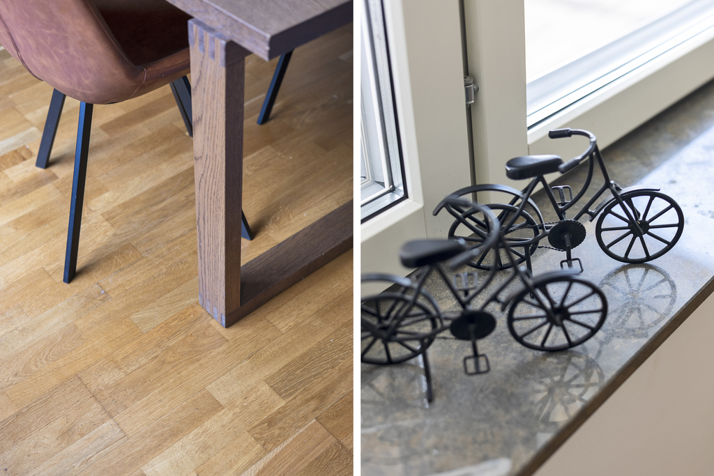 Här finns även en generöst tilltagen matplats med fönster mot den lugna och fina framsidan. Samma parkettgolv och ljusa väggar följer oss vidare in från vardagsrummet.