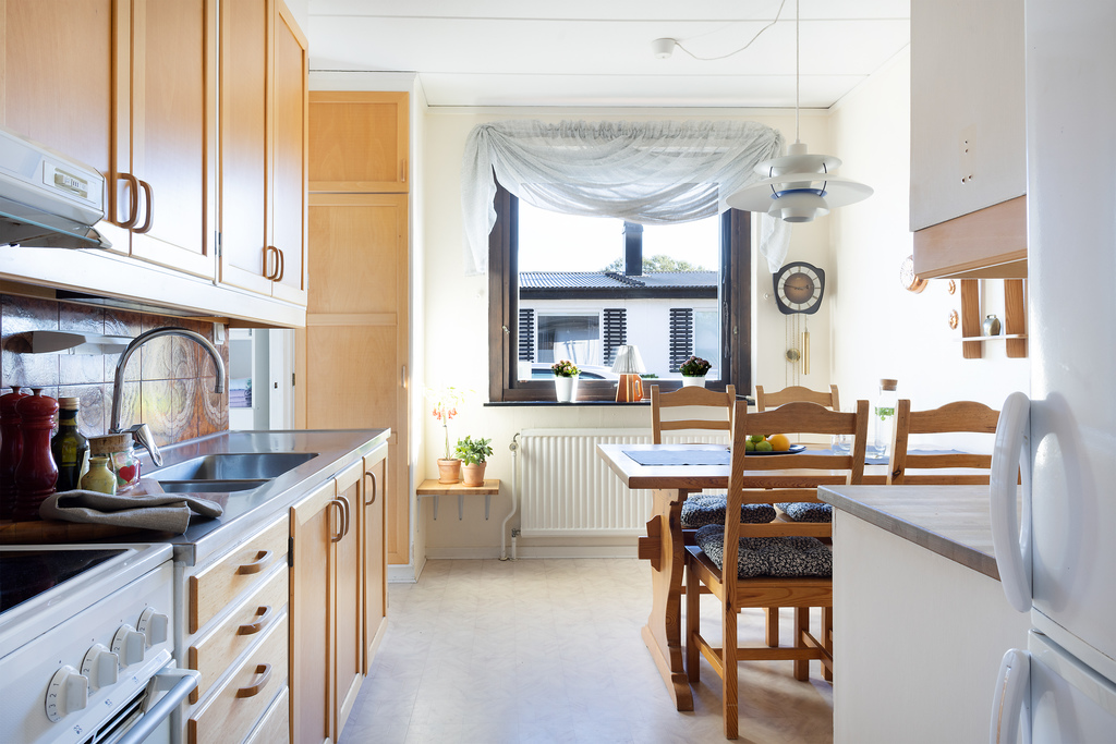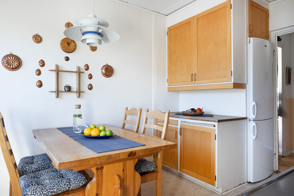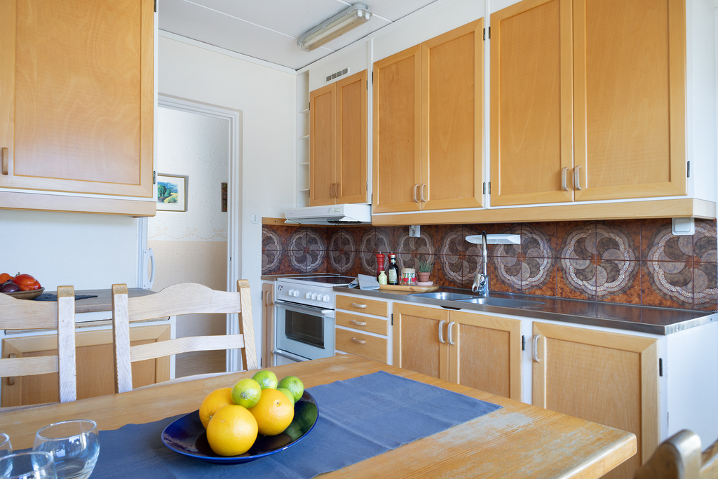 Trivsamt kök med plats för matbord med plats för 4-5 personer och stort fönster mot framsidan och släpper in ett generöst ljusinsläpp. Köket är utrustat med gott om förvaring bakom skåpluckor i bok samt arbetsytor i laminat och rostfri bänkdel. Ovanför diskbänken sitter ett karaktäristiskt kakel i varma toner som ger rummet en personlig prägel. Här finns spis med häll och ugn, fläkt samt kombinerad kyl och frys. Golvet är praktiskt plastmatta och väggarna är ljusa, vilket bidrar till en luftig känsla. Köket ligger i direkt anslutning till hallen och nära både badrum och vardagsrum.