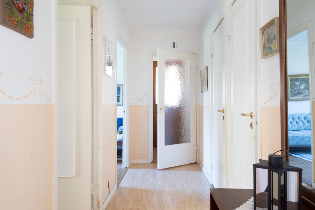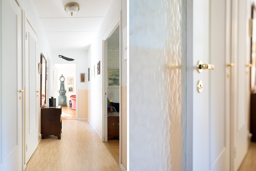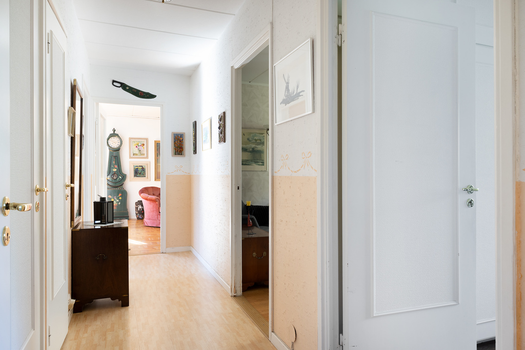 Välkommen in i en ljus och funktionell entré som direkt bjuder in till ett hemtrevligt intryck. Innanför ytterdörren möts du av en praktisk entréhall med slitstarkt klinkergolv, perfekt för avhängning och vardagsbestyr. Vidare leds du in i en inre hall med ljust laminatgolv och målade väggar i mild ton, vilket skapar en luftig känsla. Här finns gott om förvaring i form av inbyggda garderober samt tillgång till en rymlig klädkammare. Från hallen nås sovrum, kök, vardagsrum och toalett, en genomtänkt planlösning som förenklar vardagen.
