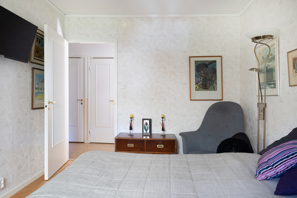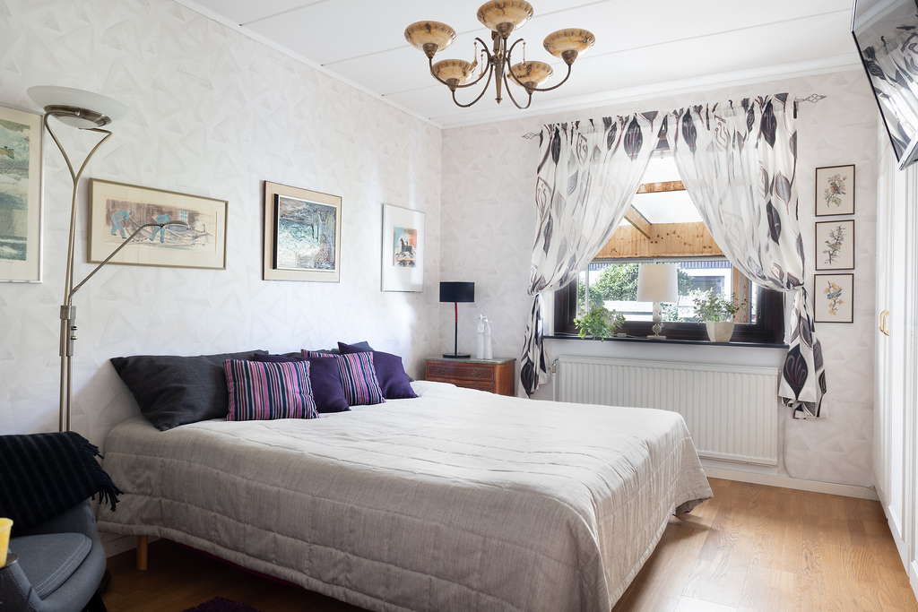 Lugnt och insynsskyddat sovrum med fönster mot det inglasade uterummet – ett tyst läge som främjar god sömn. Rummet erbjuder plats för dubbelsäng och har bra förvaring i form av platsbyggda garderober längs ena väggen. Ljusa väggar i diskret mönster samspelar med parkettgolv som ger ett varmt intryck.