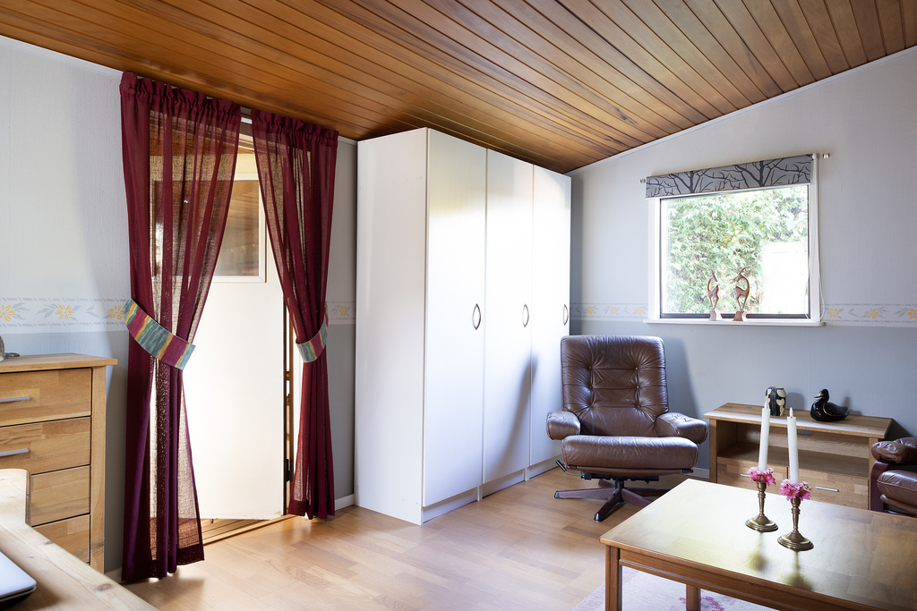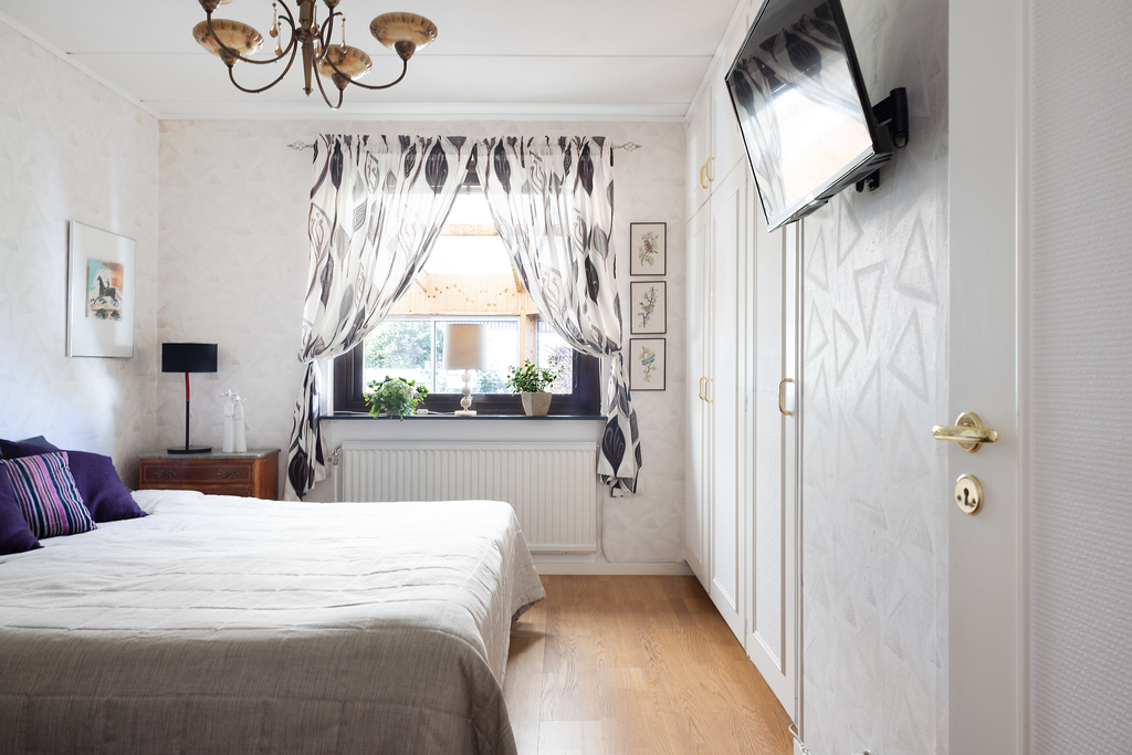 Väl tilltaget sovrum med högt i tak och fint ljusinsläpp från två väderstreck. Rummets generösa yta gör det lätt att möblera med både säng, soffgrupp eller skrivbord – perfekt för den som önskar ett kombinerat sov- och arbetsrum. Här finns också gott om förvaring i form av garderober. Från sovrum 3 nås förrådet där utgång finns ut till trädgården på baksidan.