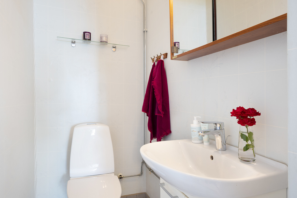 Praktisk toalett med ljusa ytskikt och tidlöst klinkergolv som nås från hallen. Här finns wc, handfat med kommod samt spegelskåp med integrerad belysning. Väggarna är klädda i ljust kakel med diskret mönster, vilket ger rummet en fräsch och luftig känsla.
