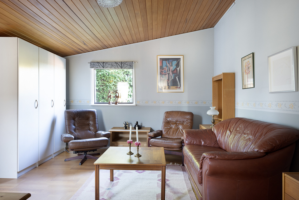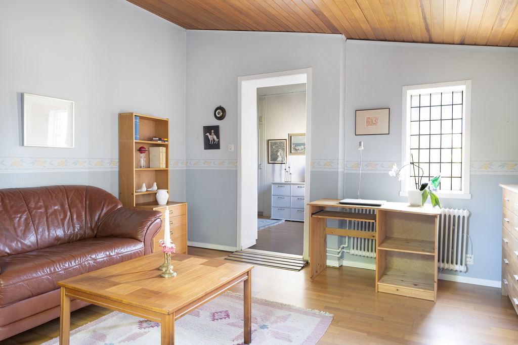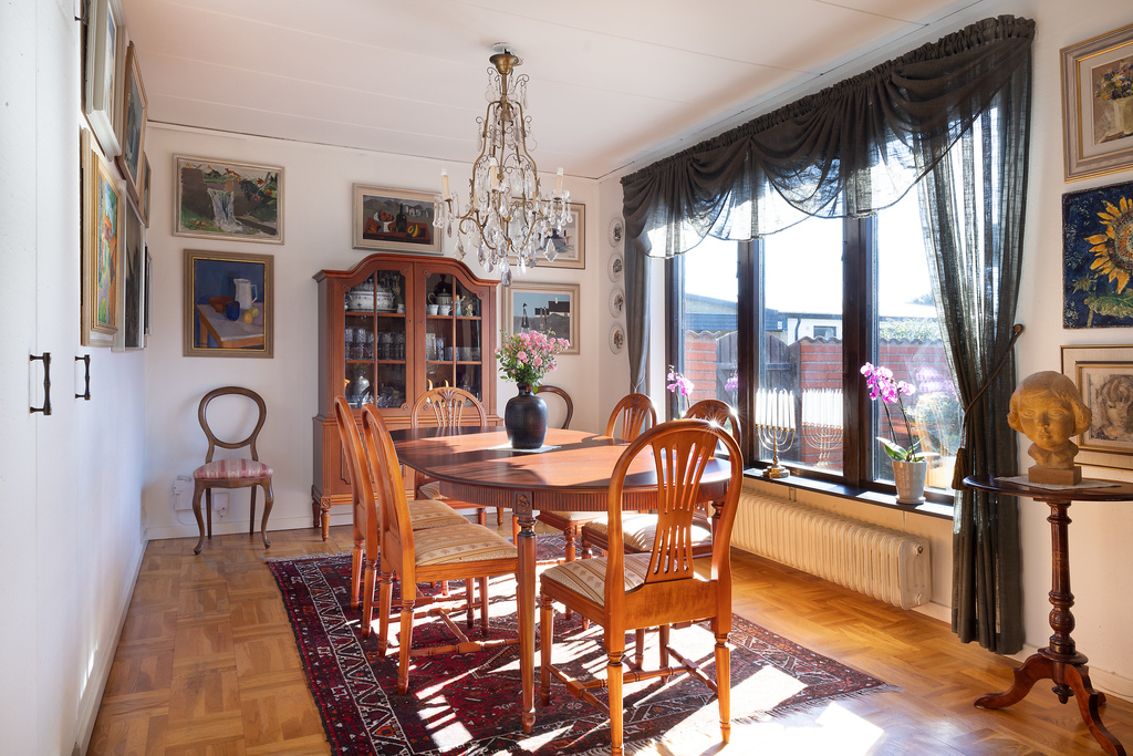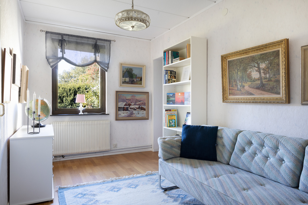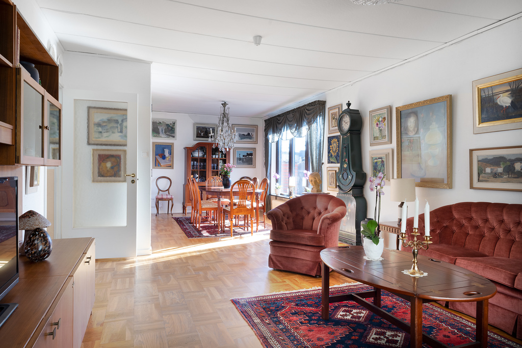 Vardagsrummet är bostadens naturliga samlingspunkt, ett generöst rum med vacker originalparkett och stora fönsterpartier som ger ett härligt ljusinsläpp. Rummets form och storlek ger god möblerbarhet och plats för både soffgrupp, läshörna och mediemöbel. Från vardagsrummet når du det inglasade uterummet via en glasad dörr, vilket förlänger bostadens sällskapsytor och suddar ut gränsen mellan inne och ute.
