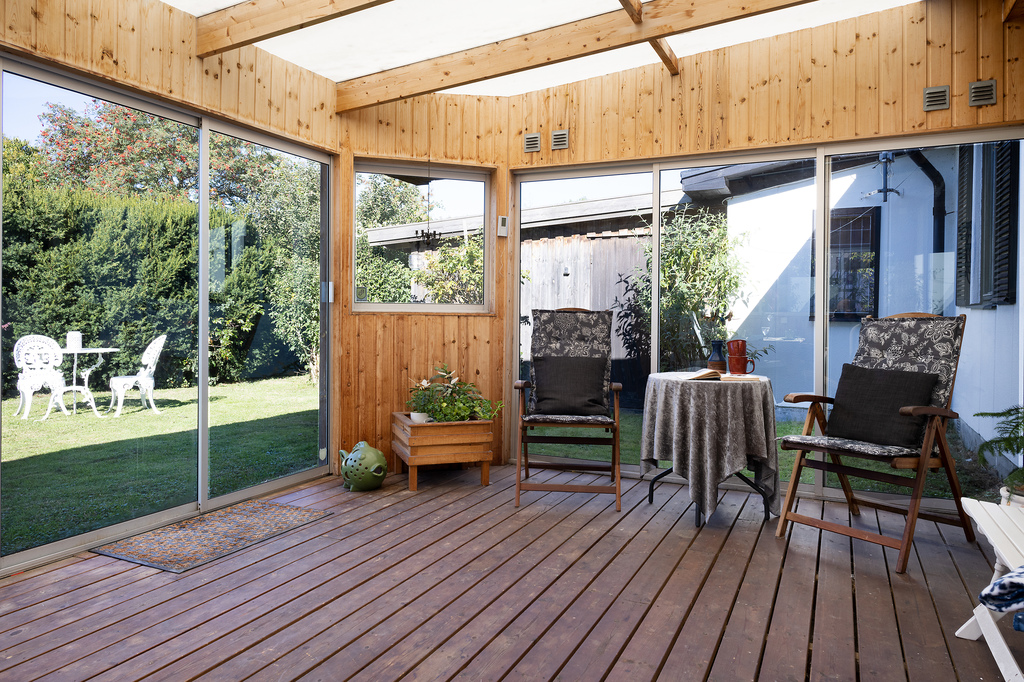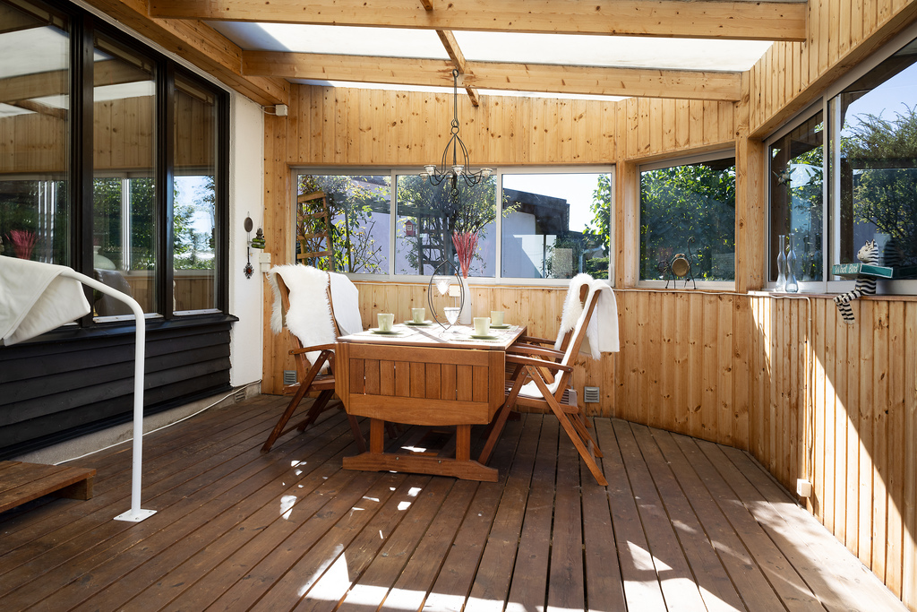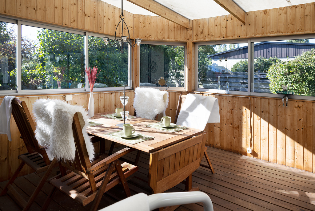 Rymligt och välskött uterum med generösa glaspartier som suddar ut gränsen mellan inne och ute. Här njuter du av trädgårdskänsla oavsett väder, tack vare skyddat läge och tak som släpper in ljus men håller regnet ute. Rummet är inrett med träpanel på väggarna och trägolv som skapar en varm och ombonad atmosfär. Uterummet är perfekt för såväl långa frukostar och middagar middagar som en stunds avkoppling. Skjutdörrar leder ut till trädgården och är en perfekt plats att njuta av både vardag och helg från tidiga våren till sena hösten.