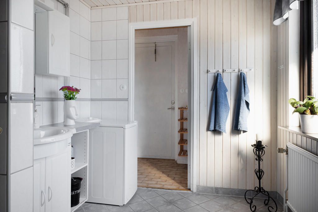 Groventrén är en praktisk ingång med tåligt klinkergolv, perfekt för vardagens av- och påklädning. Härifrån nås även det separata pannrummet med goda förvaringsmöjligheter och med plats för exempelvis verktyg, hyllor eller extra förvaring. Ett funktionellt komplement som förenklar vardagen och ger extra flexibilitet i hemmet.