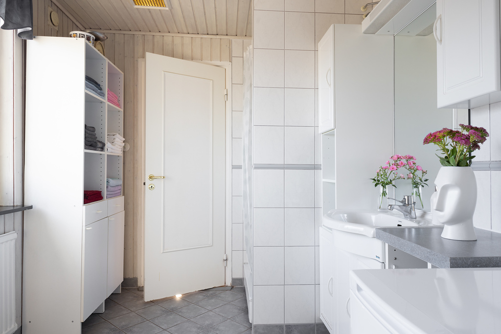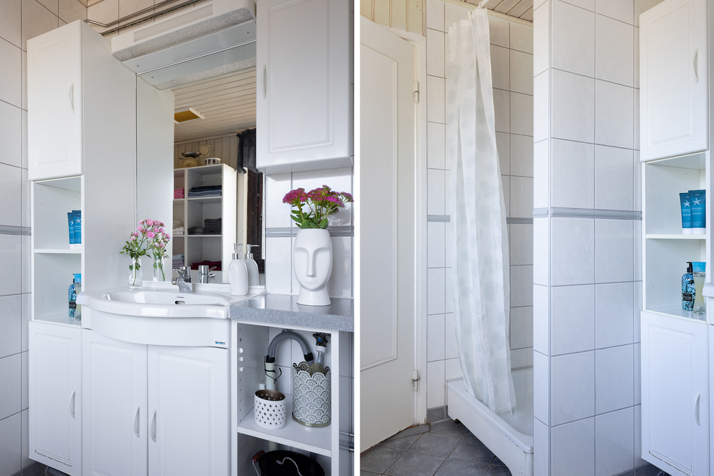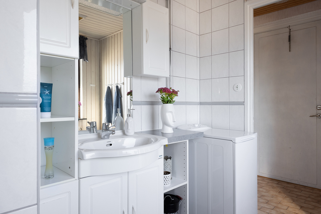 Rymligt och funktionellt badrum med integrerad tvättstuga, en praktisk lösning för vardagen. Här finns duschhörna, handfat med kommod, spegelskåp samt gott om förvaring i skåp och hyllor. Utrymmet är ljust och fräscht med kaklade väggar, klinkergolv och träpanel som ger en varm och trivsam känsla. Ett stort fönster bidrar med härligt dagsljus och skapar en luftig atmosfär.