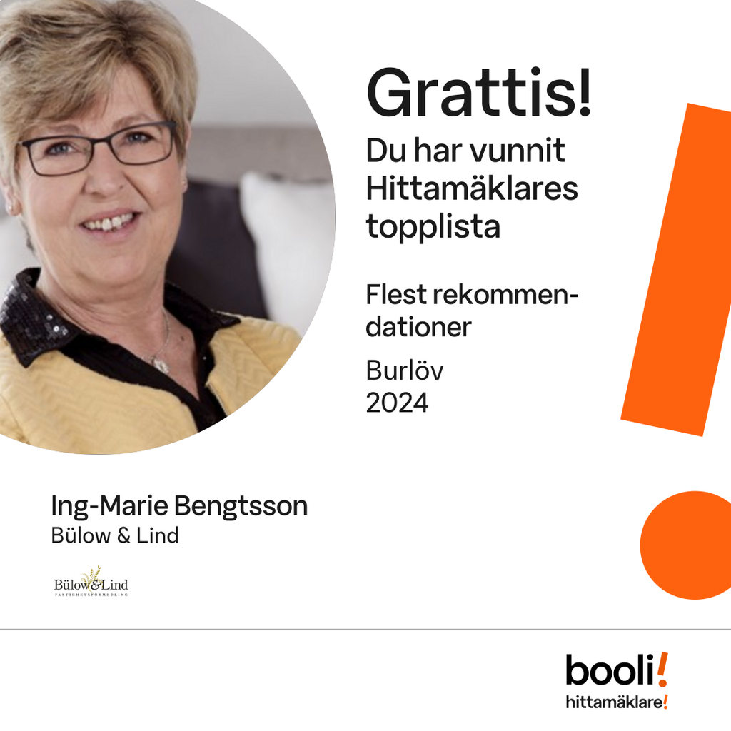 Mitt namn är Ing-Marie Bengtsson och jag har arbetat som fastighetsmäklare i Burlöv sedan 2003, då jag tog min högskoleexamen som fastighetsmäklare. Jag har bott med min familj i Åkarp i 15 år och därför har Burlövs kommun på ett naturligt sätt blivit mitt gebit. Som person är jag driven, målinriktad och social. Ska jag göra något – ska det göras ordentligt – gärna med ett leende på läpparna. År efter år är jag den mäklare som förmedlar flest bostäder och får flest rekommendationer i Burlövs kommun (källa: Hitta mäklare). Jag lovar att göra mitt bästa för att ni ska få korrekt information och att alla ska få samma möjligheter att tänka, bjuda och köpa.