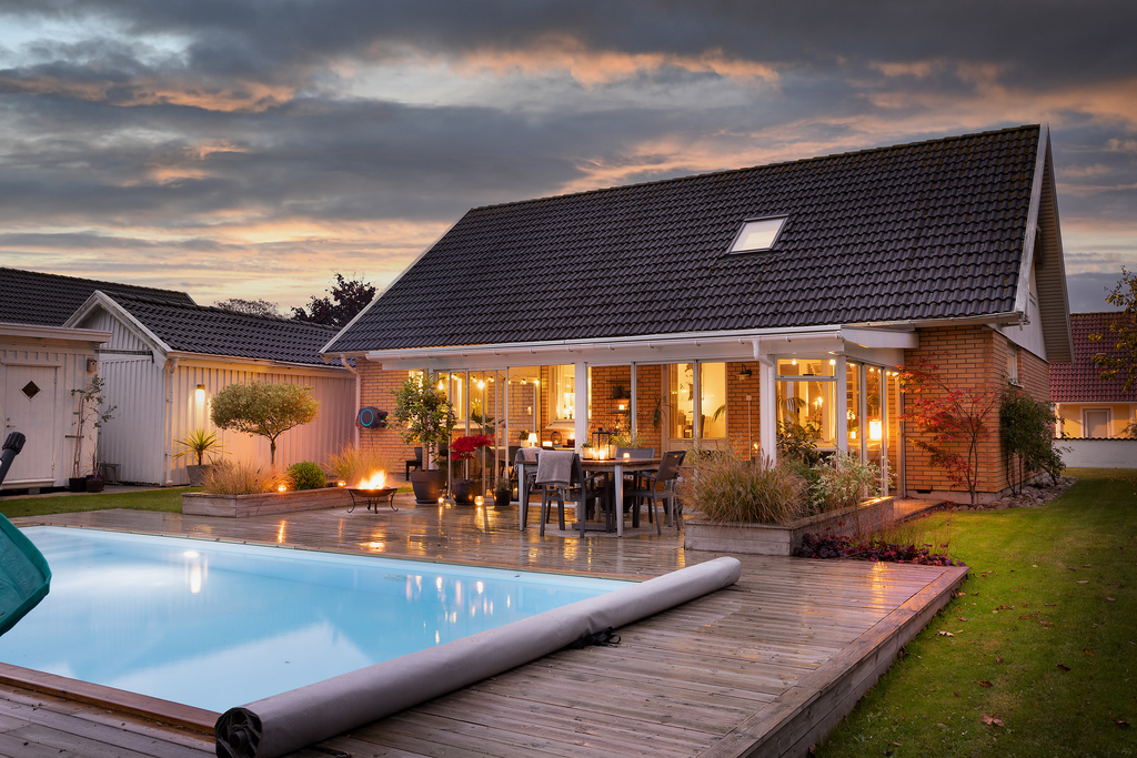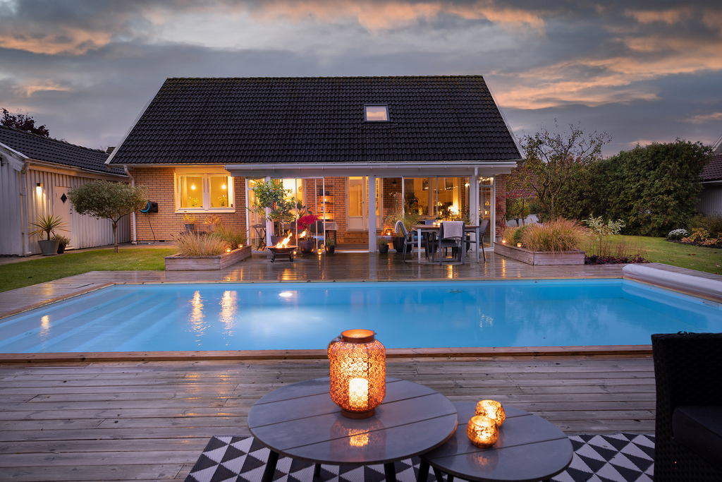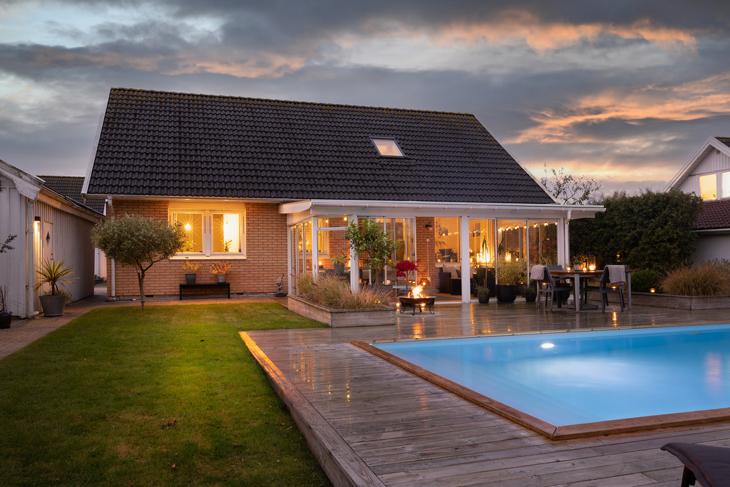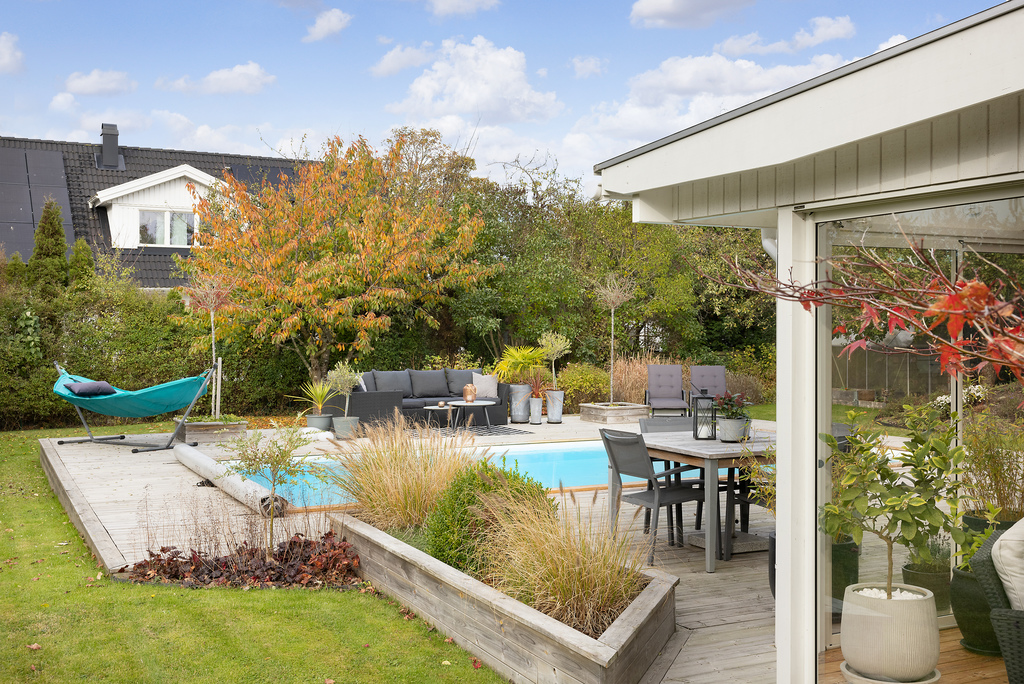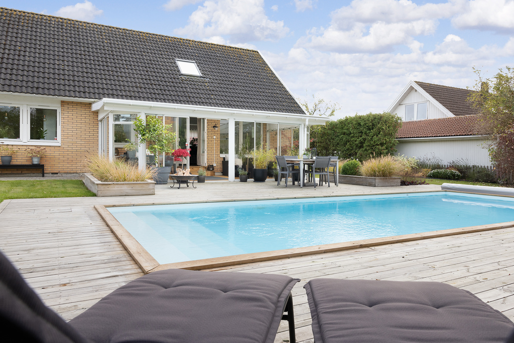 Poolområdets optimala läge erbjuder sol från morgon till kväll! Trädäcket löper runt om hela poolen och sträcker sig vidare hela vägen till uterummet. Här finns utrymme till loungemöbler, solsängar och matplats m.m. - bara fantasin som avgör.