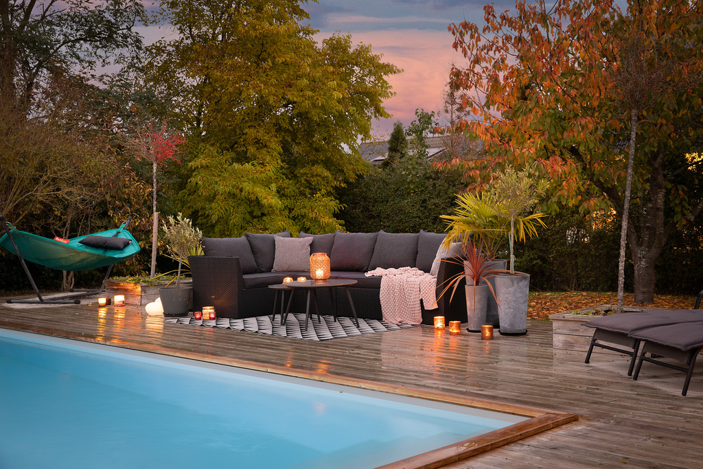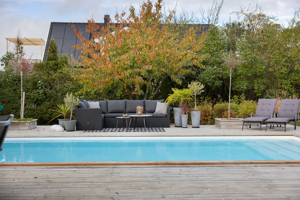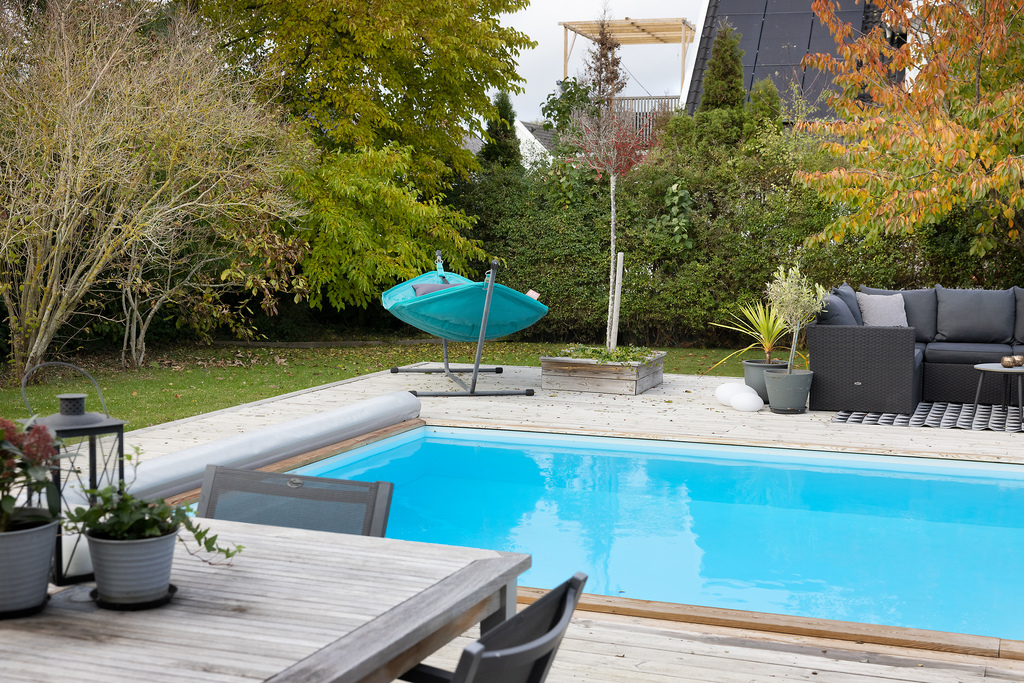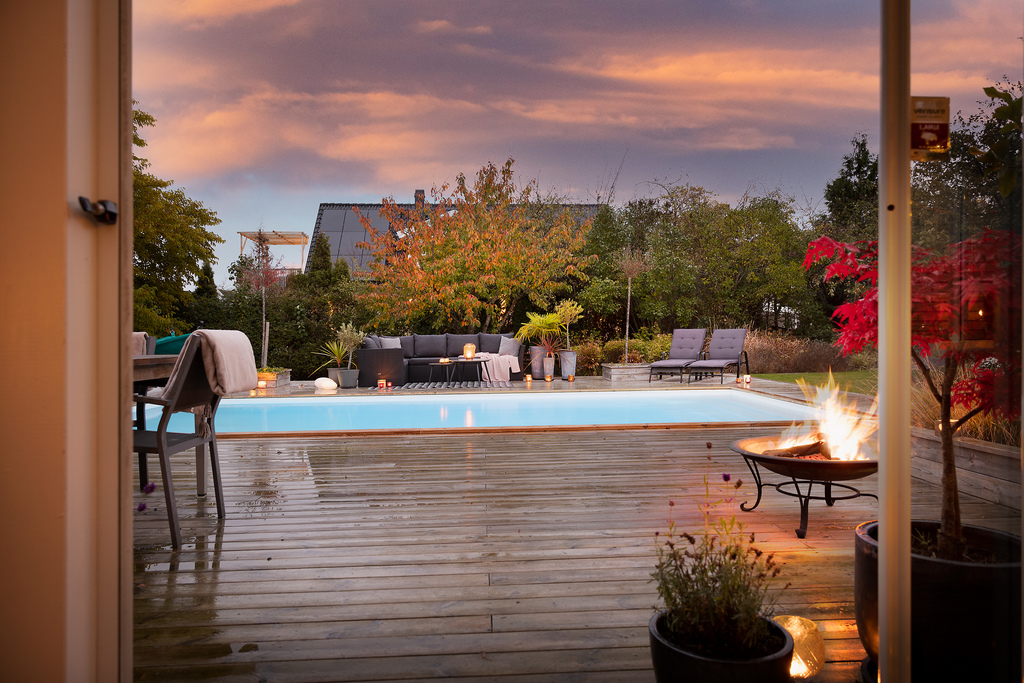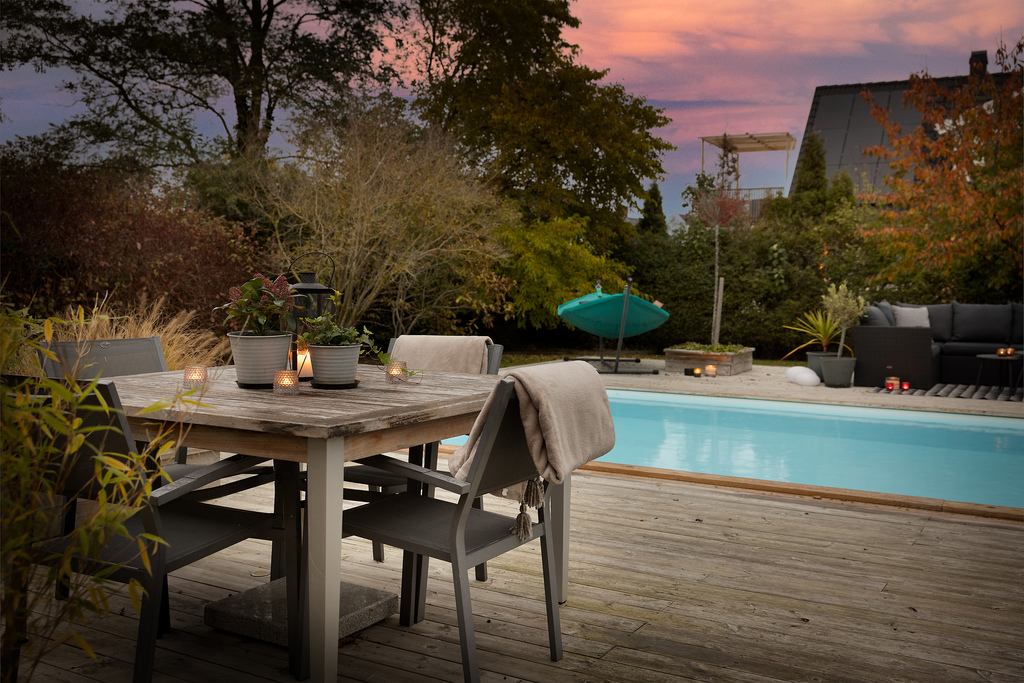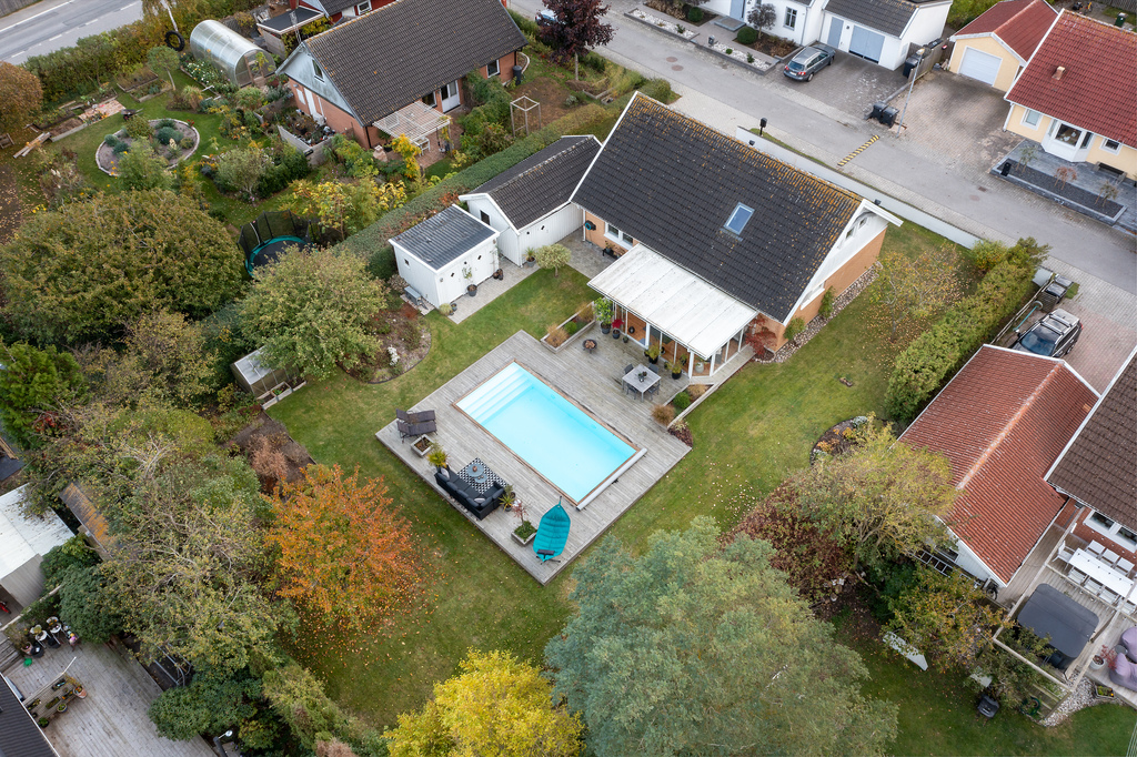 Poolområdets optimala läge erbjuder sol från morgon till kväll! Trädäcket löper runt om hela poolen och sträcker sig vidare hela vägen till uterummet. Här finns utrymme till loungemöbler, solsängar och matplats m.m. - bara fantasin som avgör.