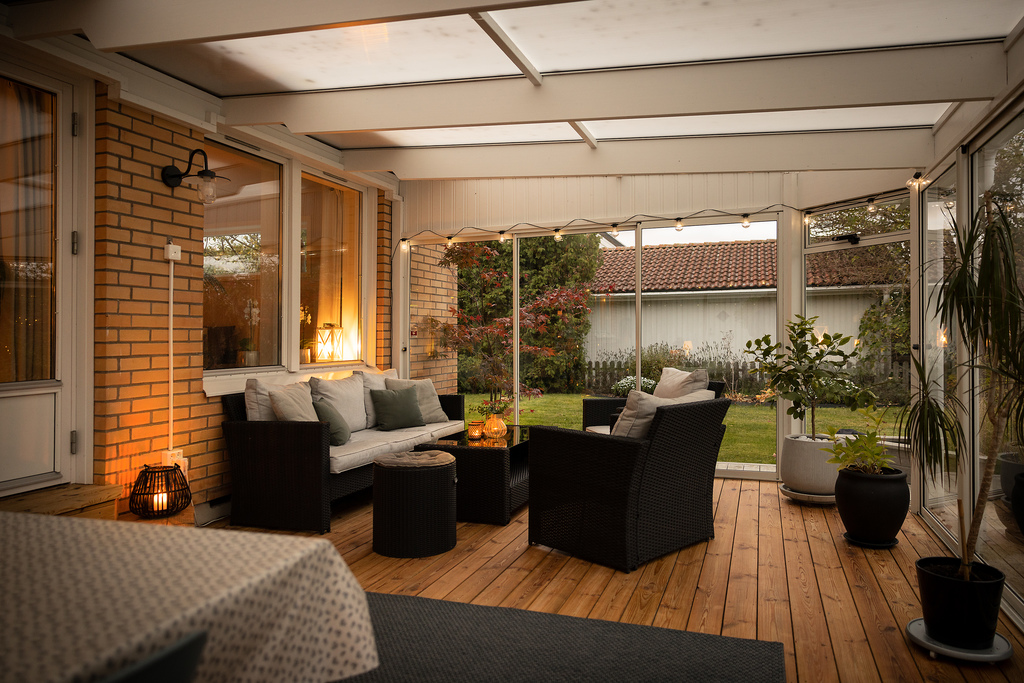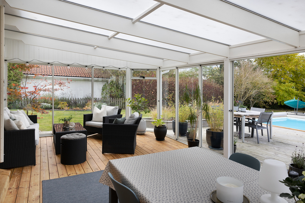 Uterummet från Willab Garden (2016) mäter hela 26 kvadratmeter - stort som ett vardagsrum och under större delen av året fungerar det precis som just det. Ett extra sällskapsutrymme där familjen gärna spenderar dagarna men även är perfekt när kvällarna börjar bli kyliga eller vädret bjuder på en regnskur - inglasningen förlänger helt enkelt utesäsongen!