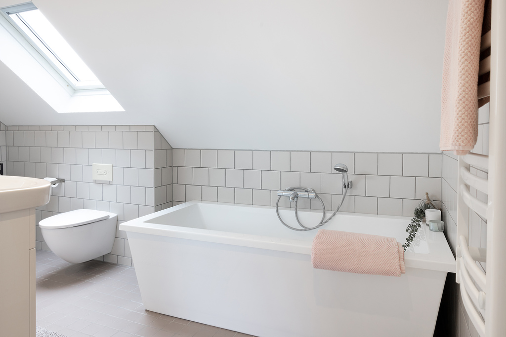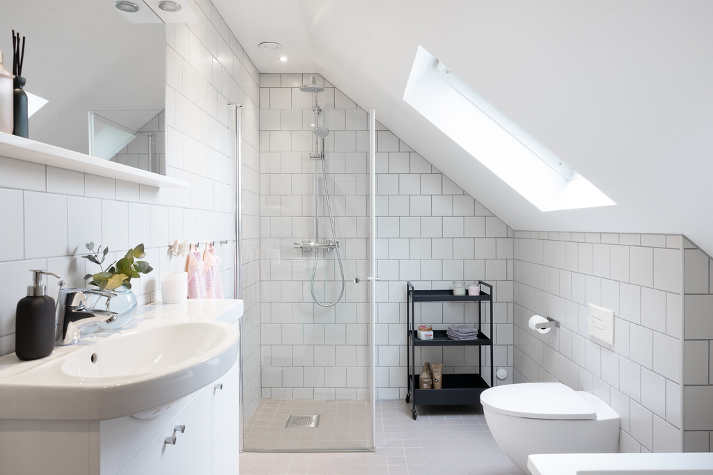 Tankarna går direkt till hotell och lyx när man kliver in i detta renoverade badrum som är något utöver det vanliga. De kaklade väggarna går i trendfärgen Greige, som varken är grå eller beige – utan en perfekt blandning av båda två, som matchas av vitmålade snedväggar och ett lite mörkare klinkergolv. Badrummets väl tilltagna yta gör att man här ges valmöjligheten mellan en snabb dusch eller ett ångande skumbad när vintervindarna viner utanför. Duschhörnan avgränsas med infällbara och platsbesparande glasdörrar och badkaret har en minimalistisk och tilltalande design. Vidare inrett med vägghängd wc, handfat med avställningsyta och underskåp, väggspegel med infälld belysning, handdukstork, infällda spotlights i taket samt vattenburen golvvärme. Takfönster i söder låter dagsljuset stråla in samtidigt som det erbjuder vädringsmöjligheter efter den varma duschen. (Renoveringen är utförd 2014 av behörig fackmän och tillhörande dokumentation på arbetet finns.)