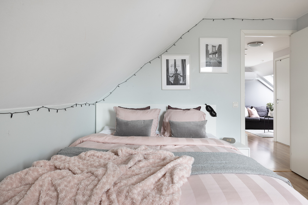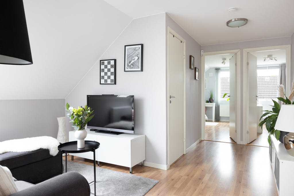 Via den vitmålade trappan når ni ovanvåningen som är hemmets mer privata del med sina 3 sovrum (som enkelt kan bli 4), trevliga allrum med takfönster, helkaklade badrum och en praktisk klädkammare som rymmer massor. Hela ovanvåning renoverades och byggdes om totalt under 2014 med alltifrån isolering, installation av värmesystem, uppbyggnad av innerväggar m.m.