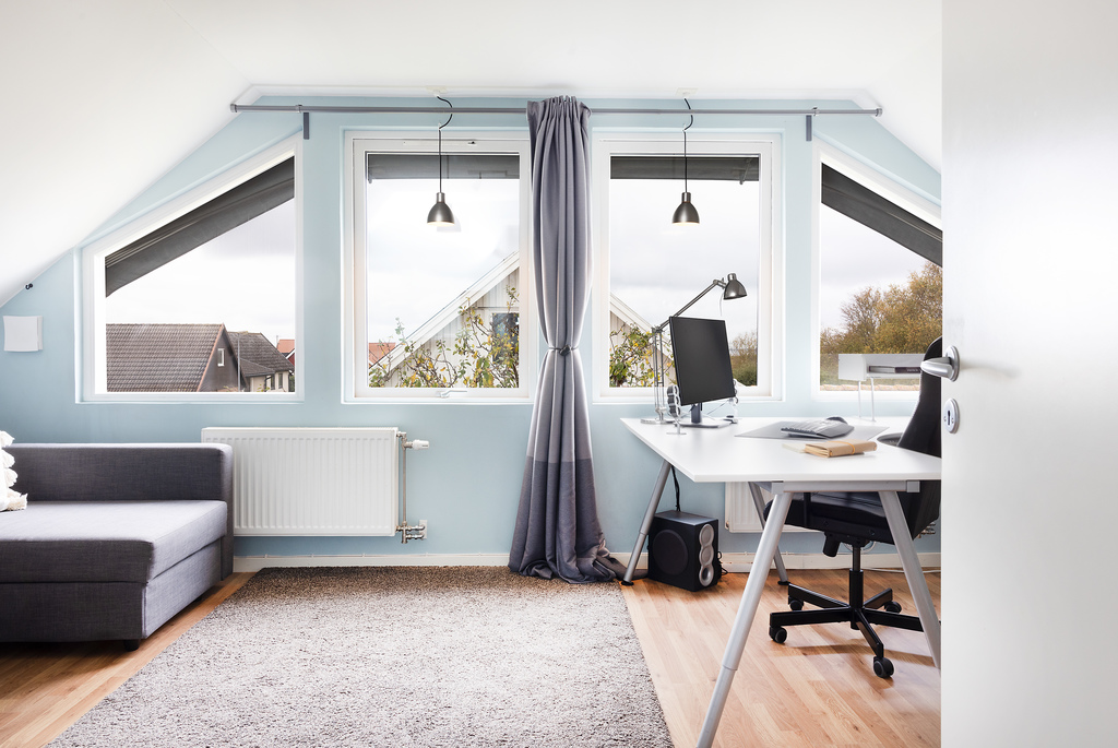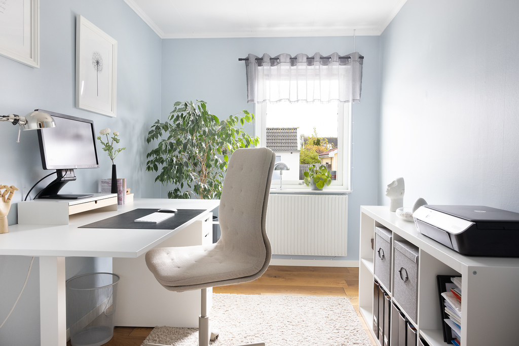 Det andra sovrummet i entréplanet används idag som hemmakontor men fungerar precis lika bra som ett barn- eller gästrum. Fönster mot husets framsida och gatan i söder.