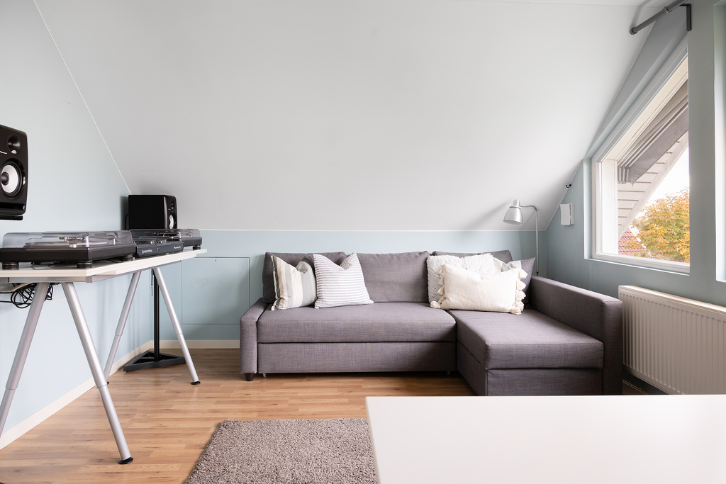 Det generöst tilltagna allrummet får massor av ljus tack vare sitt takfönster mot trädgårdssidan av huset. Rummet passar perfekt som lek- eller spelrum för barnen, arbetsplats eller varför inte ett andra vardagsrum? I allrummet finns en luft/luft värmepump som installerades 2025. Först och främst för att fungera som AC under sommarhalvåret men kompletterar också med värme vid behov.