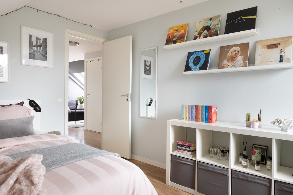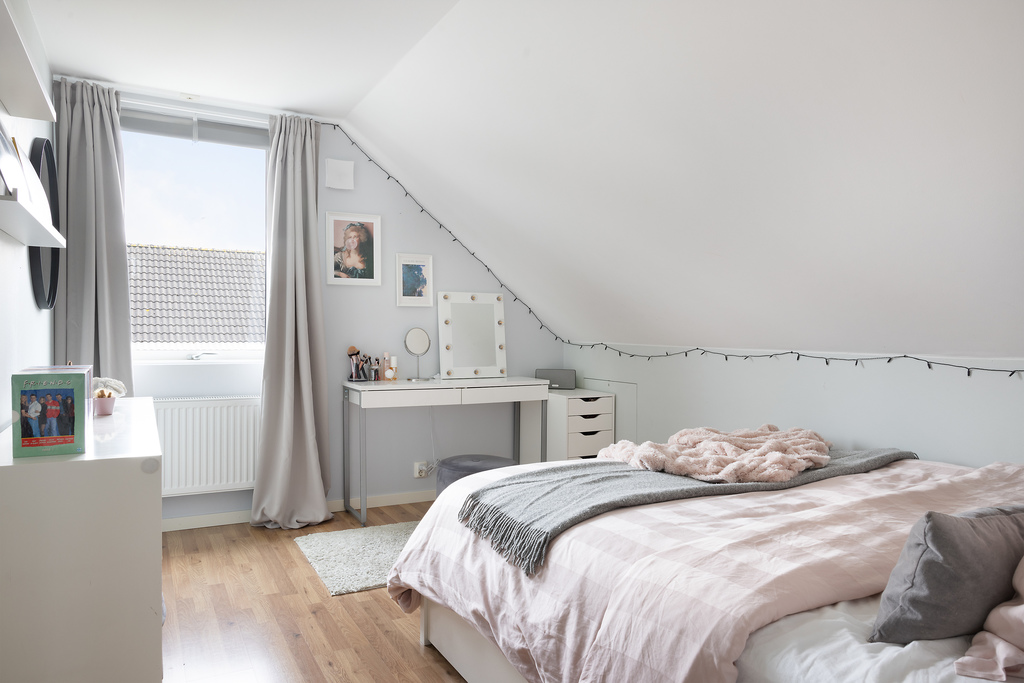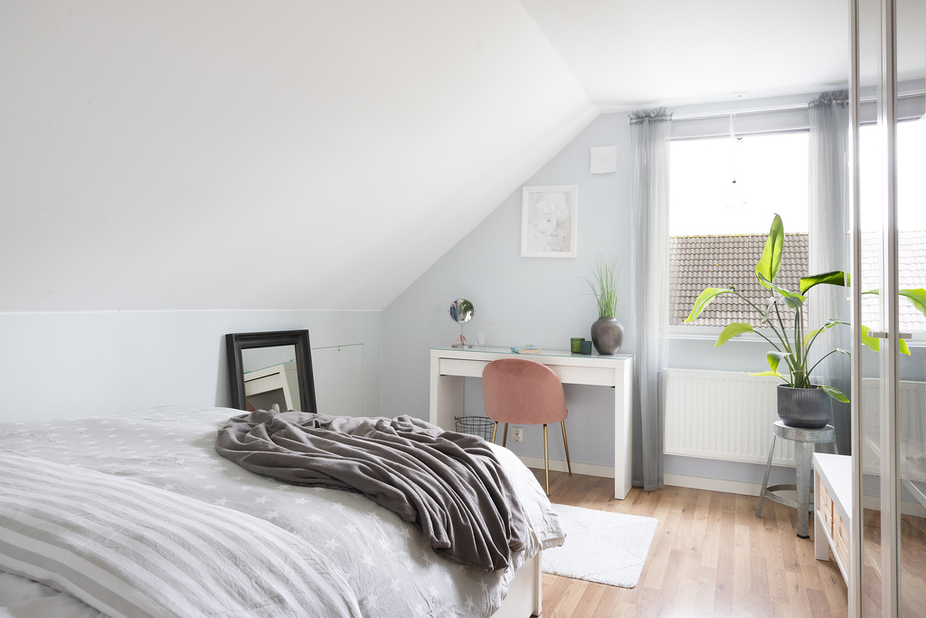 På motsatta gaveln, med fönster i öster, finner vi huset fjärde och femte sovrum som är identiska till storleken men spegelvända till utformningen. Perfekt barn- eller gästrum där säng, skrivbord och ytterligare möblemang ryms utan bekymmer.