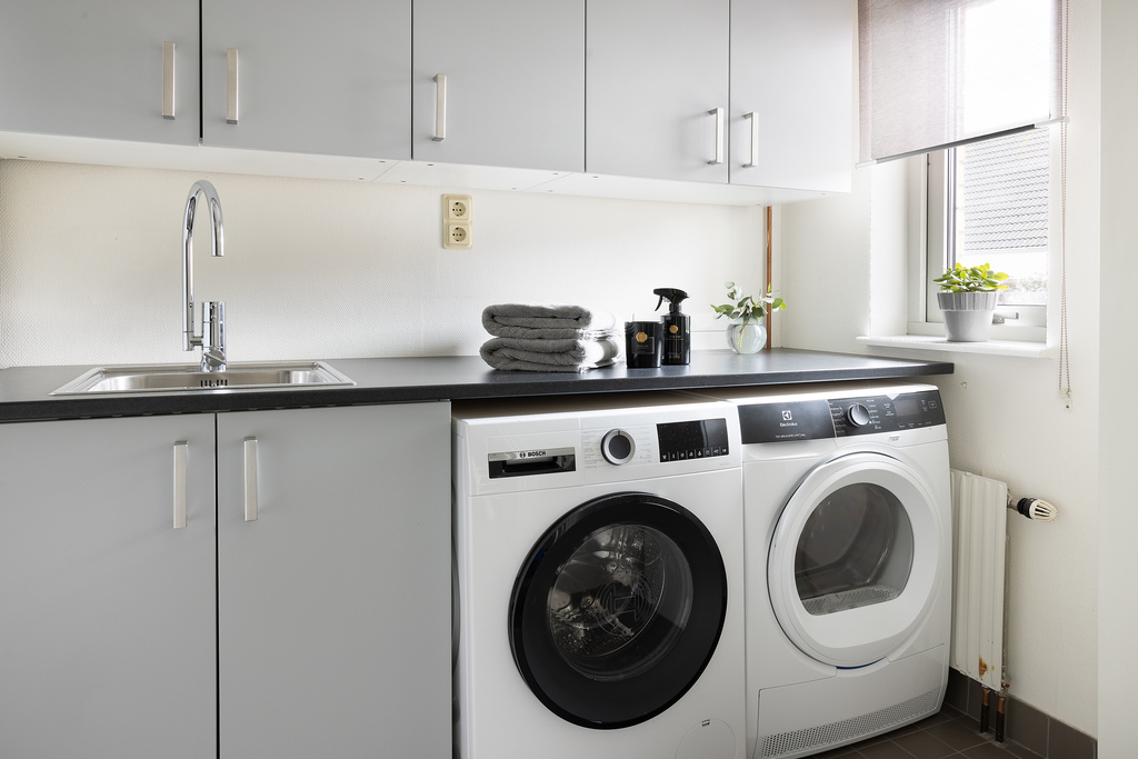 Tvättstugan genomgick även den en helrenovering 2015 med nya ytskikt och helt ny inredning. Fullutrustad med tvättmaskin (Bosch 2025) och torktumlare (Electrolux 2023) med arbetsbänk ovan, samt skåp till förvaring. Vask finns naturligtvis också att tillgå när den värsta smutsen behöver åtgärdas. I tvättstugan finner också hjärtat i husets uppvärmningssystem, frånluftsvärmepumpen från 2018. Fönster mot gatan erbjuder dagsljus och vädringsmöjligheter. (Renoveringen är utförd av behöriga fackmän och tillhörande dokumentation på arbetet finns.)