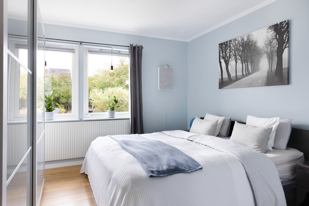 Med fönster mot trädgården i svalt norrläge ligger entréplanets stora sovrum placerat. Generöst tilltaget till ytan vilket gör att dubbelsängen enkelt ryms tillsammans med övrigt möblemang om så önskas. Ypperliga förvaringsmöjligheter i form av en bred skjutdörrsgarderob samt tre inbyggda garderober.