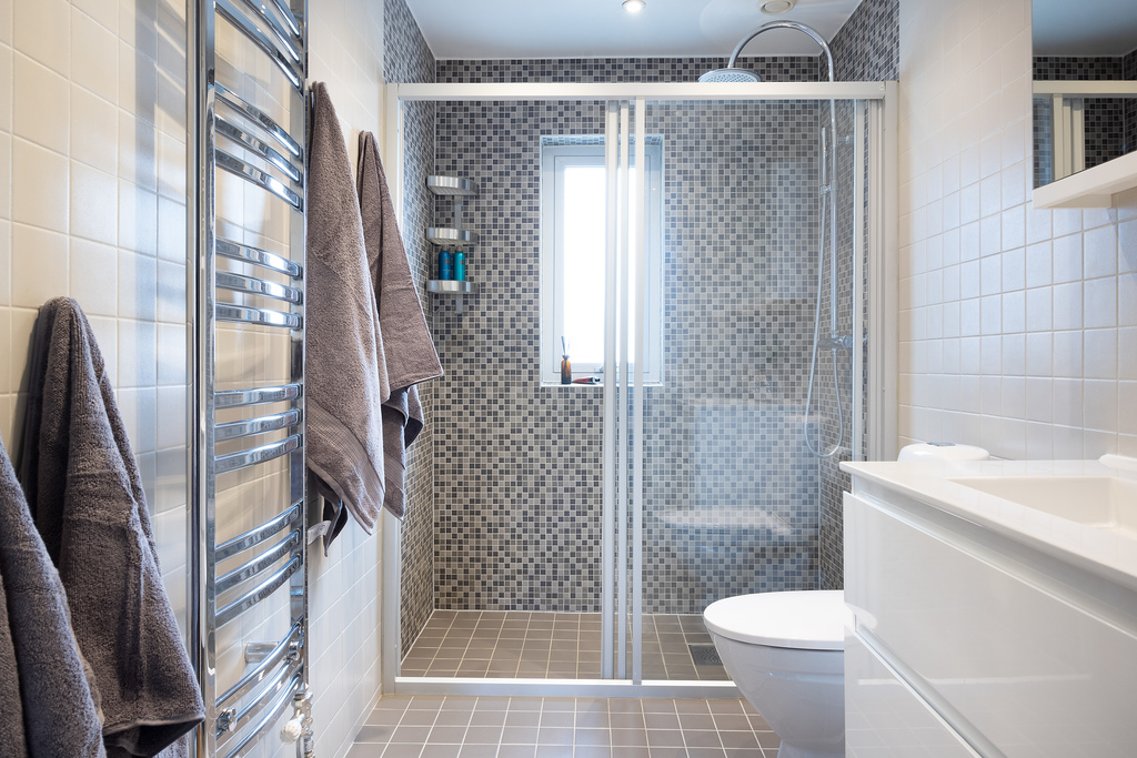Entréplanets helkaklade badrum renoverades 2015 och har ljusa väggar som bryts av mot mosaikpartiet i duschörna och det matchande klinkergolvet. Duschen omgärdas av skjutbar vägg i glas som miimerar risken för blött golv i resten av badrummet. Vidare inrett med underliggande golvvärme (elektrisk), infällda spotlights i taket, handfat med kommod, väggskåp med spegel, wc och handdukstork som går på både el och det vattenburna värmesystemet. Fönster ger både bra med dagsljus och vädringsmöjligheter. (Renoveringen är utförd av behöriga fackmän och tillhörande dokumentation på arbetet finns.)