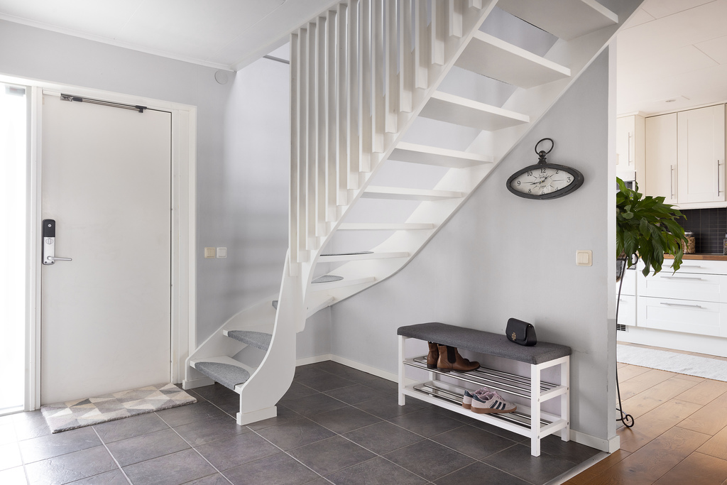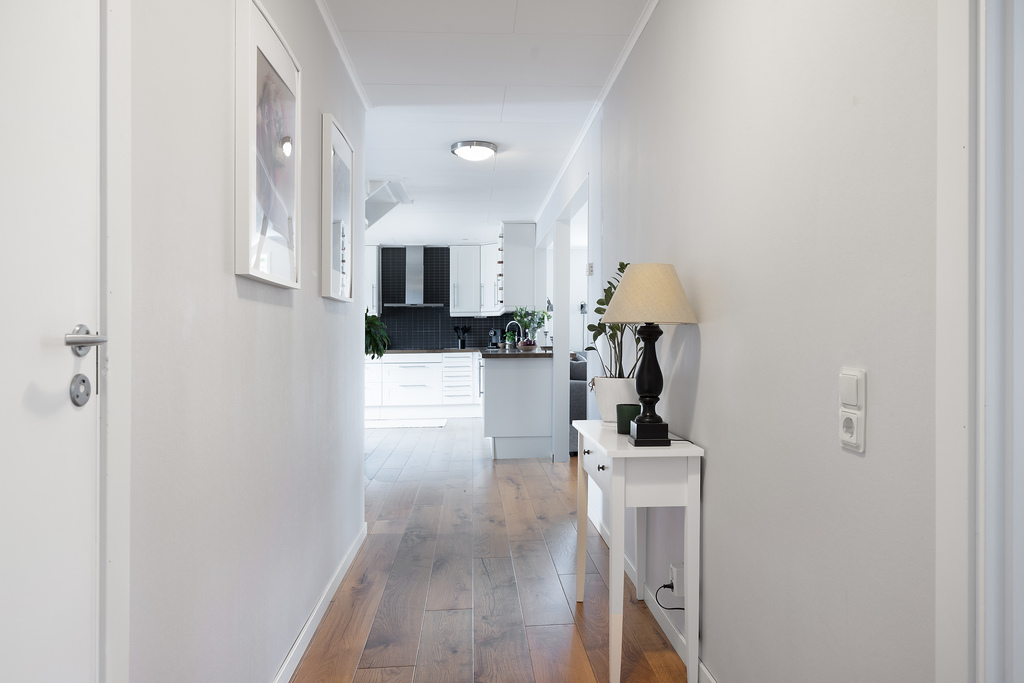 Välkomnande entréhall med härlig siktlinje mot vardagsrum/uterum och i dess förlängning poolen och trädgården. Praktiskt klinkergolv direkt innan för dörren som sedan övergår i klassisk ekparkett vilken är genomgående i hela våningsplanet. Den generösa ytan möjliggör möblering med byrå, garderob m.m.