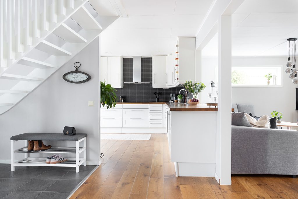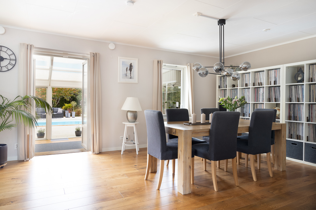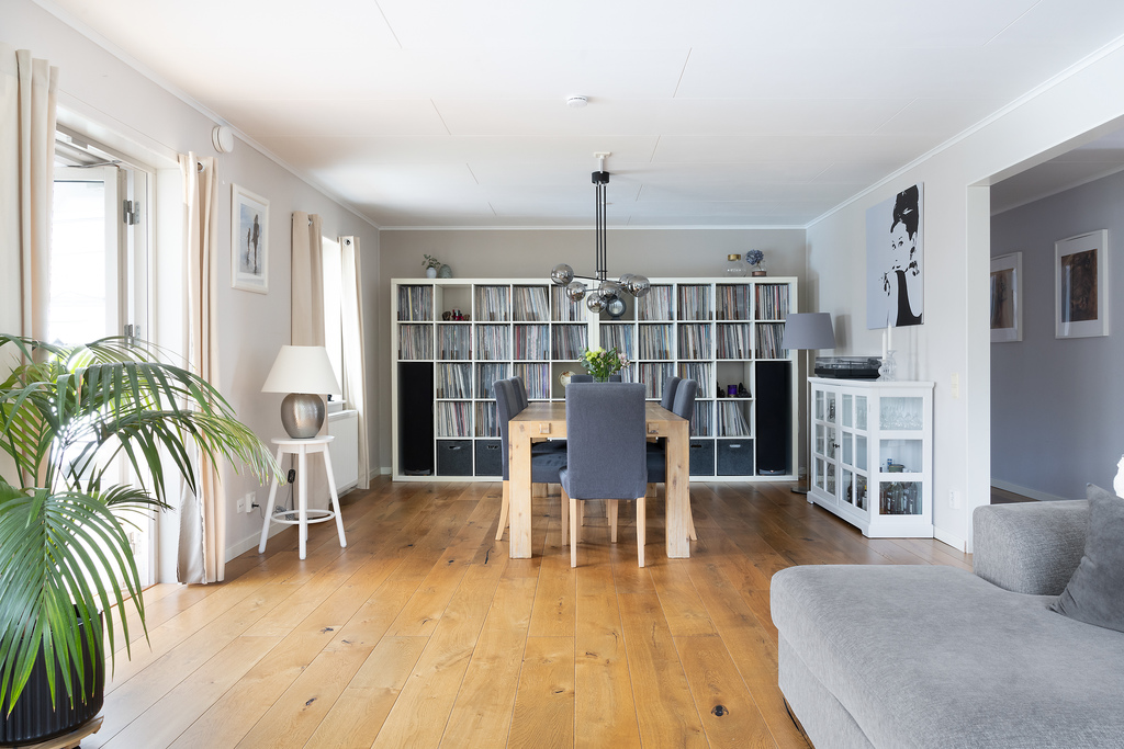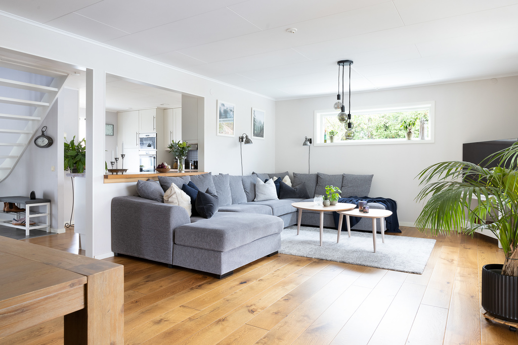 Härlig känsla i luftigt vardagsrum med stort fönsterparti och utsikt över trädgården plus att ett nytt fönster tagits upp på husets västergavel vilket låter ännu mer dagsljus flöda in. Från vardagsrummet finns även dörr ut till uterummet. Stora ytor som ger gott om plats för både soffgrupp och matsalsmöblemang samt möjlighet att avdela till ett extra sovrum om så önskas. Delvis öppen planlösning mot köket bidrar till den luftiga och moderna känslan.