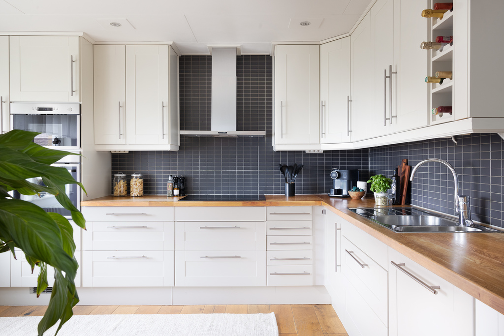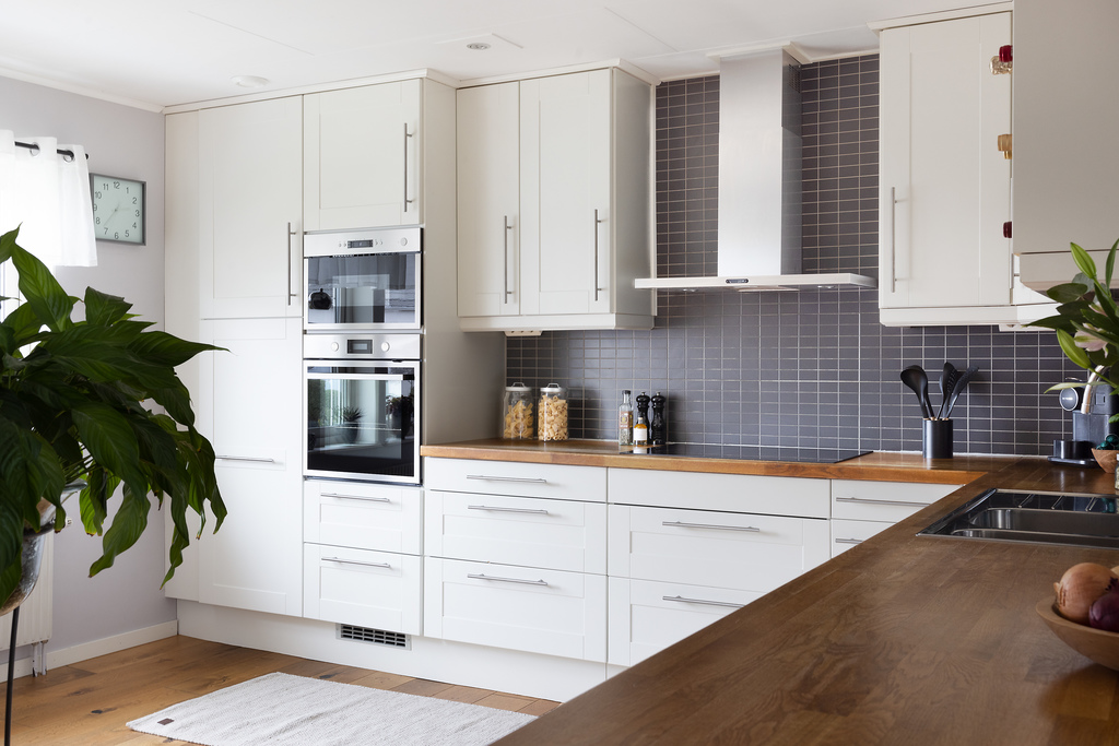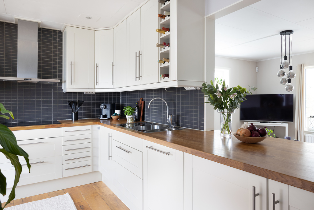 Köket helrenoverades under 2013 samtidigt som väggen mot vardagsrummet öppnades upp för en mer social planlösning. Vit köksinredning från IKEA som kontrasterar mot handtag i metall och den massiva bänkskivan i ek samt det grå kaklet ovan. Den låga delen av köksinredningen, mot vardagsrummet, är förutom en källa till extra förvaring och arbetsyta ett komplement till matplatsen där man kan få sällskap till matlagningen, äta mindre mål eller varför inte en plats att låta barnen göra läxorna? Dessutom är den en utmärkt serveringsyta när gästerna bänkar sig runt bordet. Fullutrustat med induktionshäll (IKEA 2013), inbyggd ugn (IKEA 2025) och mikro (IKEA 2025) i praktisk arbetshöjd, spisfläkt (IKEA 2013), integrerad diskmaskin (Siemens 2023) samt kyl och frys i fullstorlek (Siemens 2013).
