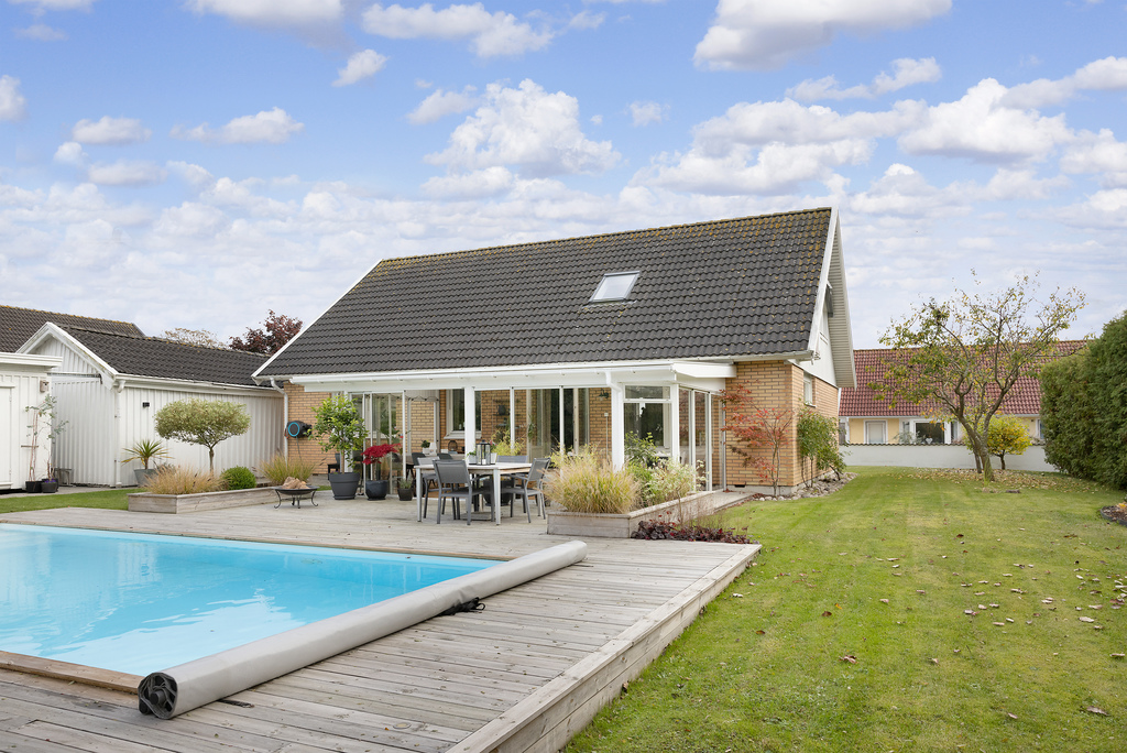 På återvändsgata utan trafik och med ett av Klagshamns bästa lägen, med utsikt över havet och strandängarna, ligger denna rymliga och välskötta 1,5-plansvilla med stor trädgård, inglasat uterum och pool. 166 m² fördelat på 7 rum och kök varav 5 sovrum, som med enkla medel kan bli 7 om behovet finns. Huset bjuder på ett mycket generöst tilltaget vardagsrum med fönsterparti i dubbla väderstreck och fönsterdörr till uterummet/trädgården samt delvis öppen planlösning mot köket. I entréplanet finns utöver det renoverade köket också två sovrum, renoverat badrum och tvättstuga. Ovanvåningen erbjuder 3 bra sovrum, som enkelt kan bli 4, generöst allrum med klädkammare samt renoverat och helkaklat badrum med både dusch och badkar. Den insynsskyddade tomten mäter hela 1 072 m² och huset är smart placerat så att största ytan blir i den välplanerade och uppväxta trädgården där vi också hittar poolen med sitt härliga poolområde – allt med utsikt över strandängarna. Mot trädgården ligger också uterummet om 26 m² som förlänger säsongen på både vår och höst och ger skydd när regnet faller. Välkomna!