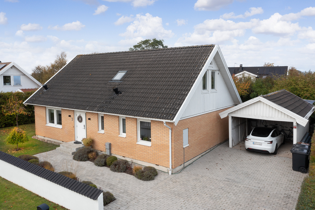 Carport med plats för en bil och plats för flera bilar på den rymliga uppfarten. Laddbox (2023) för elbil finns installerad. I carportens förlängning finns två stycken förråd.
