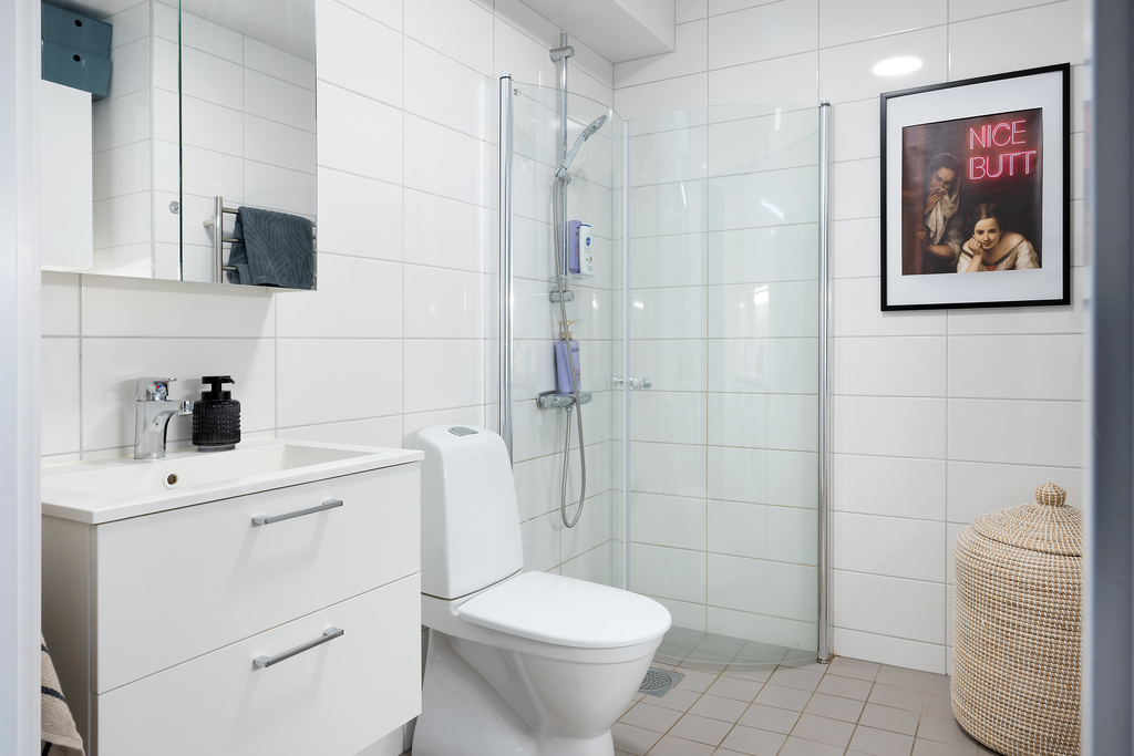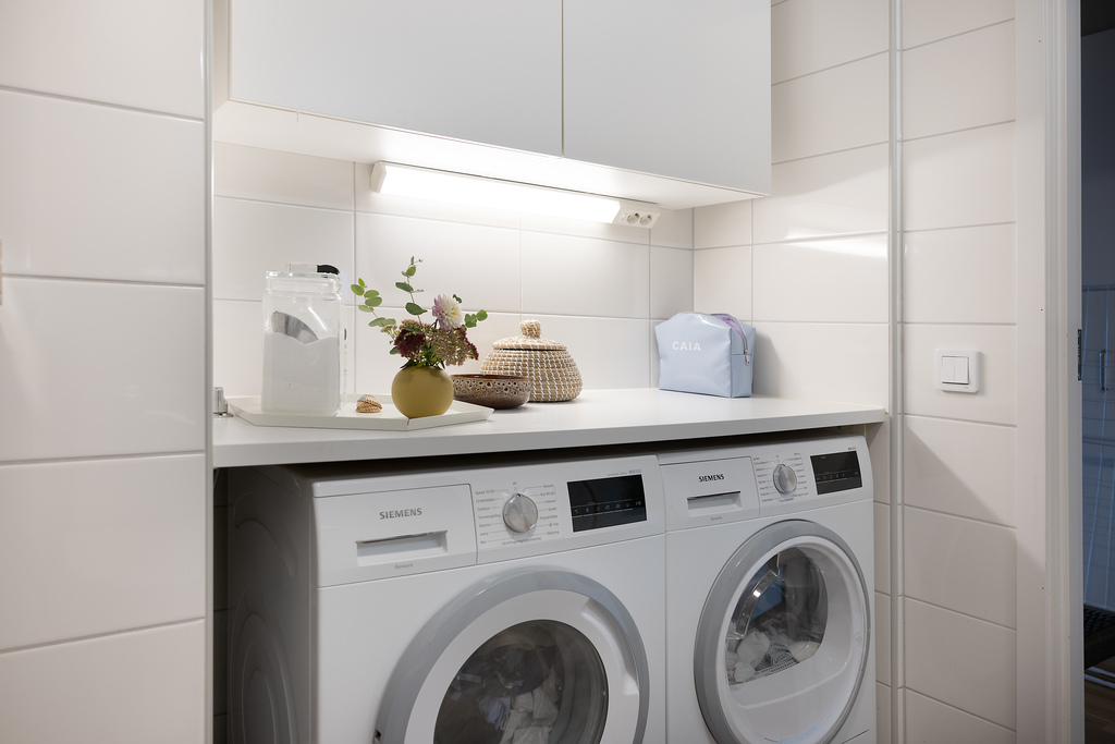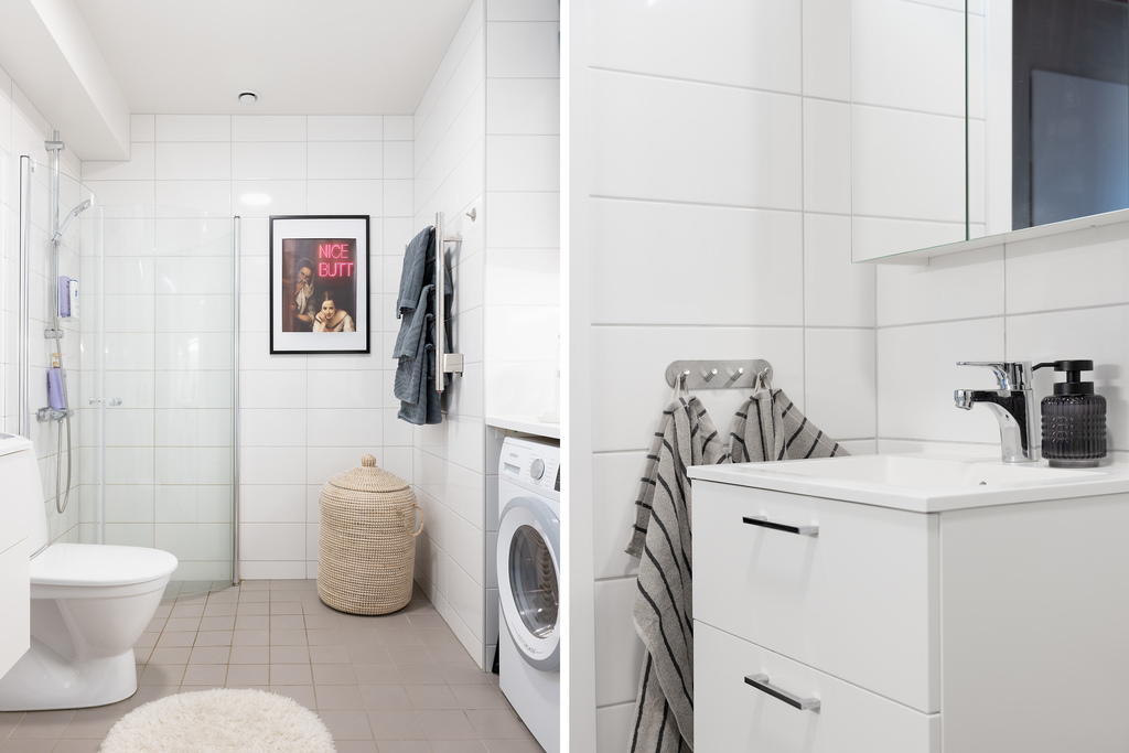 Direkt från hallen nås lägenhetens helkaklade badrum. Klassisk färgskala med grå klinker och vitt kakel som väl matchas av den helvita badrumsinredningen. Dusch med infällbara och platsbesparande glasväggar, wc, handfat med kommod och väggfast spegelskåp. På motsatta väggen hittar ni tvättmaskin och torktumlare med praktisk arbetsbänk ovan samt två väggfasta skåp till ytterligare förvaring.