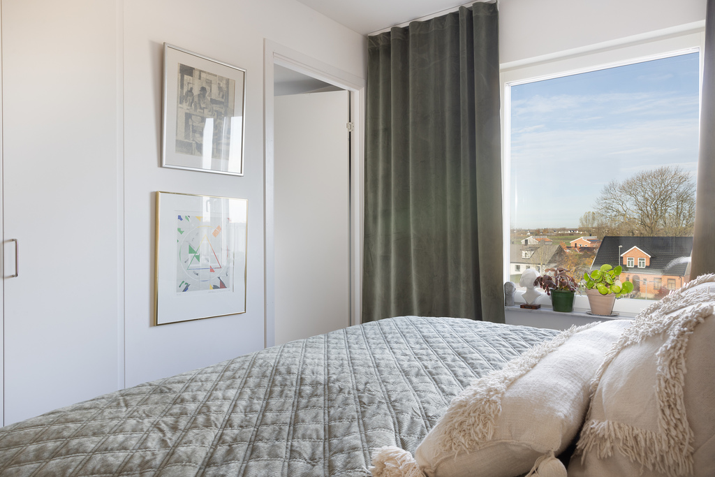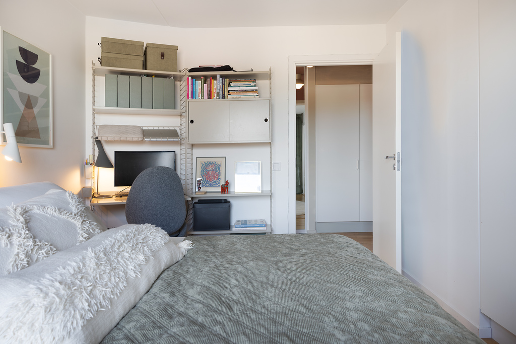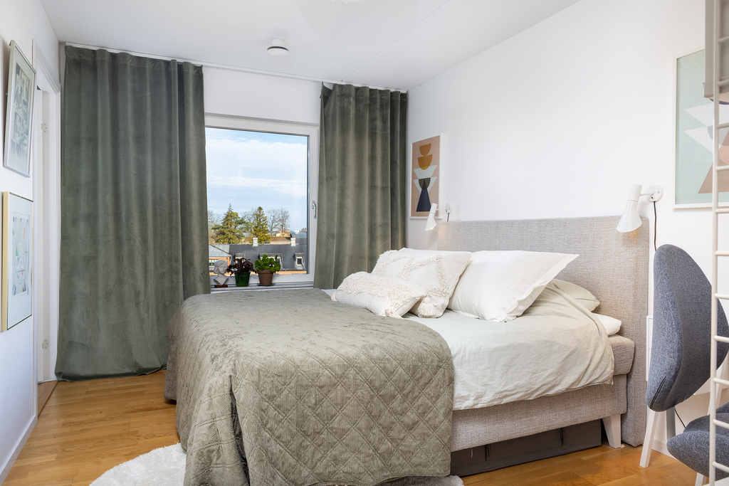 Väl tilltaget sovrum som rymmer både dubbelsäng och ytterligare möblemang om så önskas. Dubbla garderober finns till förvaring. Från sovrummet nås en rymlig klädkammare med fönster vilket ger ytterligare fria ytor i rummet men som även kan användas som ett kompakt hemmakontor, eller som idag, ett sovrum för minstingen. Fönster i svalt norrläge med fantastiskt utsikt in över Malmö.